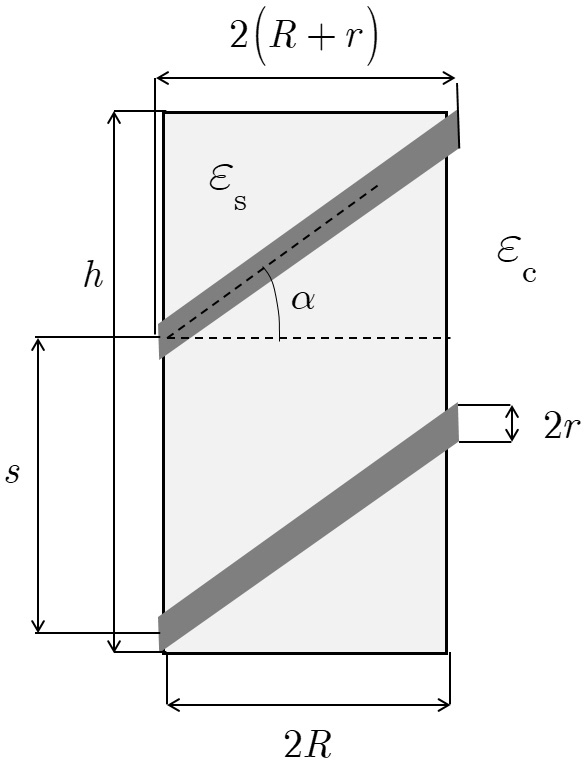 Зеркально-асимметричный элемент представляет собой тонкопроволочную проводящую однозаходную спираль, состоящую из витков радиуса расположенных друг от друга на расстоянии (шаг спирали). Обозначим через длину спирали в развернутом состоянии, а через – радиус тонкой проволоки. На рис. 3 показано поперечное сечение спирального элемента. На рис. 3 введены следующие обозначения: – высота контейнера; – расстояние между витками спирали; – внутренний радиус спирали; – радиус проволоки; – угол накрутки спирали; – число витков спирали.