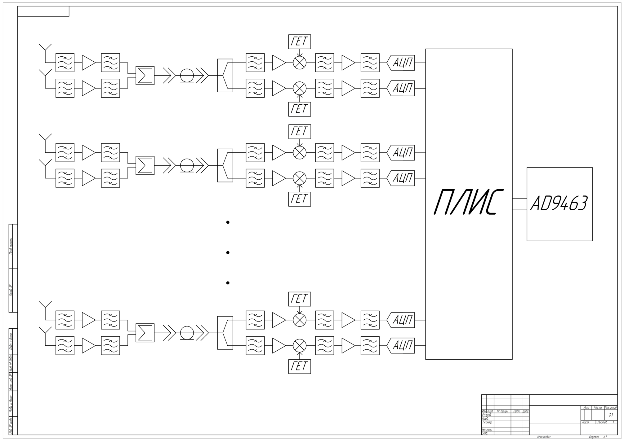 Построенный пространственно-временной фильтр был реализован в ПНП, устроенном следующим образом. Входными сигналами ПНП служили спутниковые сигналы, принятые на активную АР, представляющую собой объединение в одном корпусе двух восьмиэлементных кольцевых эквидистантных АР с разными радиусами, соответствующими диапазонам L1 и L2. После прихода на АР спутниковые сигналы каждого из диапазонов проходили через каскад «полосовой фильтр (ПФ) – усилитель (У) – ПФ» и сумматор, после чего по кабелю передавались в ПНП. Сигнал, поступивший на вход ПНП, проходил через делитель мощности, после чего результирующие сигналы проходили через каскады «ПФ – У» и смесители, в которых смешивались с гетеродинами, соответствующими каждому из сигнальных диапазонов. Затем сигналы снова проходили через каскады «ПФ – У – ПФ» промежуточной частоты и аналого-цифровые преобразователи (АЦП), после чего подавались на вход ПЛИС AMD Xilinx Kintex UltraScale XCKU035, где выполнялась пространственно-временная обработка. После этого каждый из сигналов попадал в передающий тракт одного из двух трансиверов Analog Devices AD9463, где выполнялась демодуляция сигнала, который затем передавался на вход приемника u-blox ZED-F9P, где происходило решение навигационной задачи. Схема АР и ПНП представлена на рис. 1.