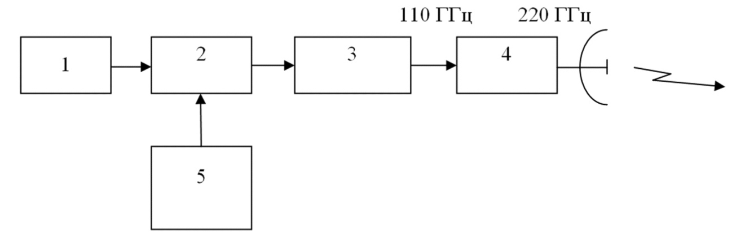Рис. 2. Схема передатчика: 1 - генератор на диэлектрическом резонаторе (ГДР) (7,333 ГГц); 2 - модулятор (амплитудная манипуляция) (АМн); 3 - умножитель частоты на 15; 4 - удвоитель частоты; 5 – цифровой интерфейс до 1 Гбит/с