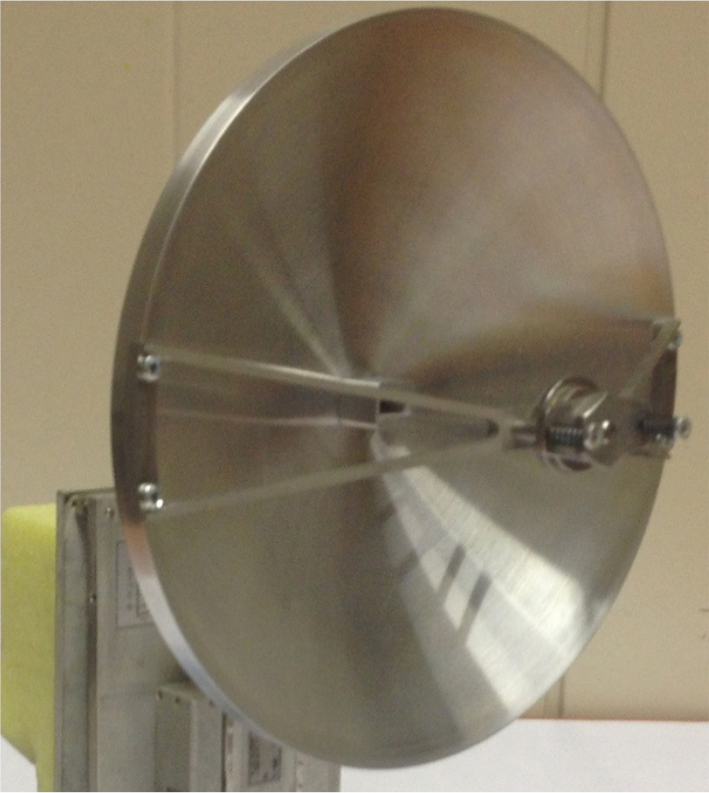 С использованием результатов расчетов была спроектирована и изготовлена антенна Кассегрена, предназначенная для использования в высокоскоростной системе связи на частоте 220 ГГц, имеющая диаметр основного и вспомогательного зеркал 200 мм и 16 мм, соответственно. В качестве облучателя для антенной системы использовался пирамидальный рупор, питаемый прямоугольным волноводом сечением мм. Внешний вид антенны показан на рис. 7.