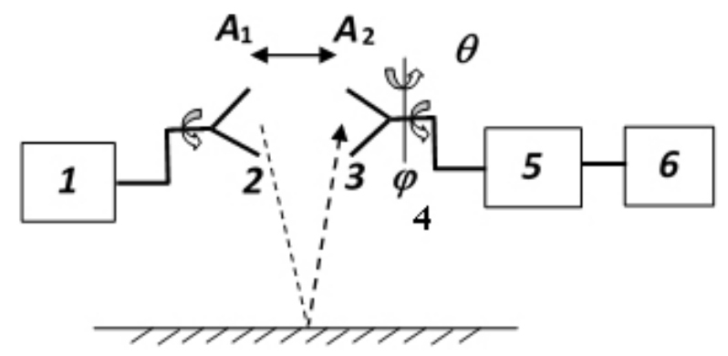 Экспериментальное исследование антенны Кассегрена [13] проводилось по стандартной методике измерения в дальней зоне [14]. На рис. 8 представлена структурная схема измерительной установки. Исследуемая антенна 3 (работающая в режиме приема) расположена на опорно-поворотном устройстве 4. На некотором расстоянии r в дальней зоне этой антенны расположена вспомогательная передающая антенна 2, возбуждаемая генератором 1. Приемное устройство 5 имеет индикатор мощности 6, поступающей на вход приемного устройства. Зависимость показаний этого индикатора р от угла поворота антенны 3 при некотором фиксированном угле поворота является сечением диаграммы направленности антенны по мощности в плоскости Выбирая различные значения угла можно измерить ДН в различных сечениях. При проведении измерений важно обеспечить отсутствие отражений от пола, потолка, стен (см. штриховую линию на рис. 8) и других окружающих предметов в измерительной лаборатории. Для ослабления влияния отраженных сигналов на отражающие поверхности укладывались щиты с поглощающим электромагнитное поле покрытием.