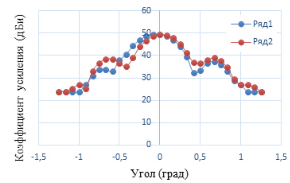 В качестве вспомогательной антенны использовалась рупорно-линзовая антенна с коэффициентом усиления 26 дБи. Шаг измерения ДН составлял 5 угловых минут. Настройка антенны на максимальное значение КУ проводилась путем регулировки субрефлектора по трем координатам. Результаты экспериментального исследования исследуемой антенны приведены на рис. 9.