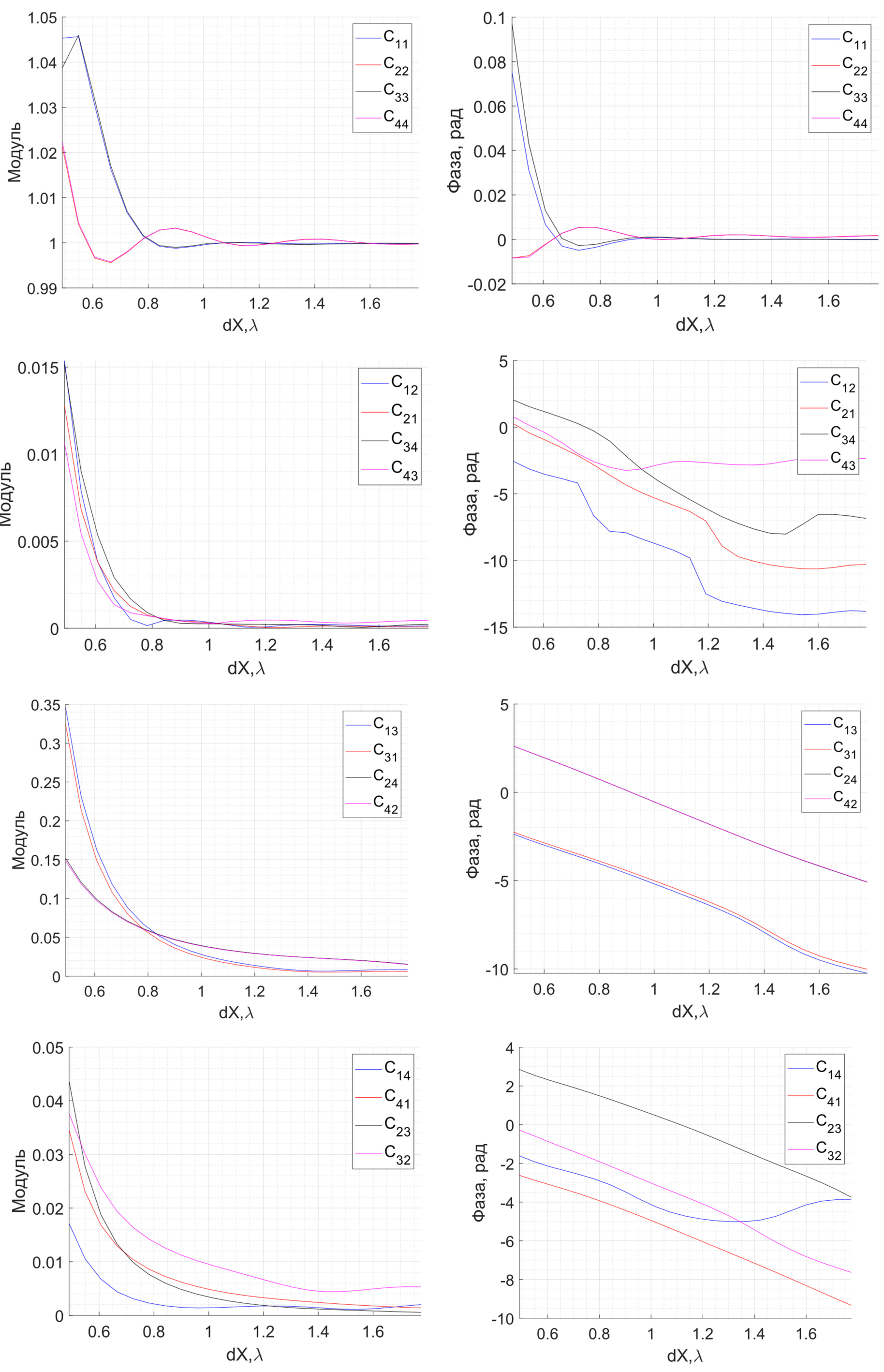 Далее, в работе было проведено исследование взаимного влияния АЭ в зависимости от расстояния между ними (dX). Оно варьировалось от половины до полутора рабочих длин волн. Для каждого значения расстояния вычислялась матрица взаимного влияния. Графики зависимостей элементов матрицы С, представленные на рис. 3, подтверждают, что с увеличением расстояния между АЭ решетки приводит к значительному уменьшению взаимного влияния. В дальнейшем эти зависимости понадобятся для верификации результатов расчетов с применением предложенной модели.