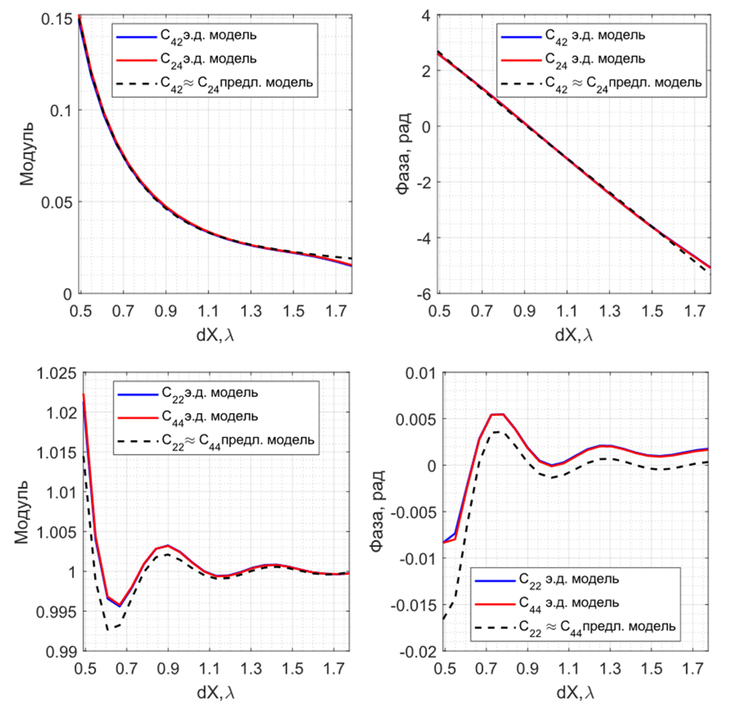 Рис. 6. Зависимости модуля и фазы коэффициентов C22, C24, C42 и C44, рассчитанных с помощью предложенной модели и полученных в результате электродинамического моделирования, от расстояния между АР в решетке
