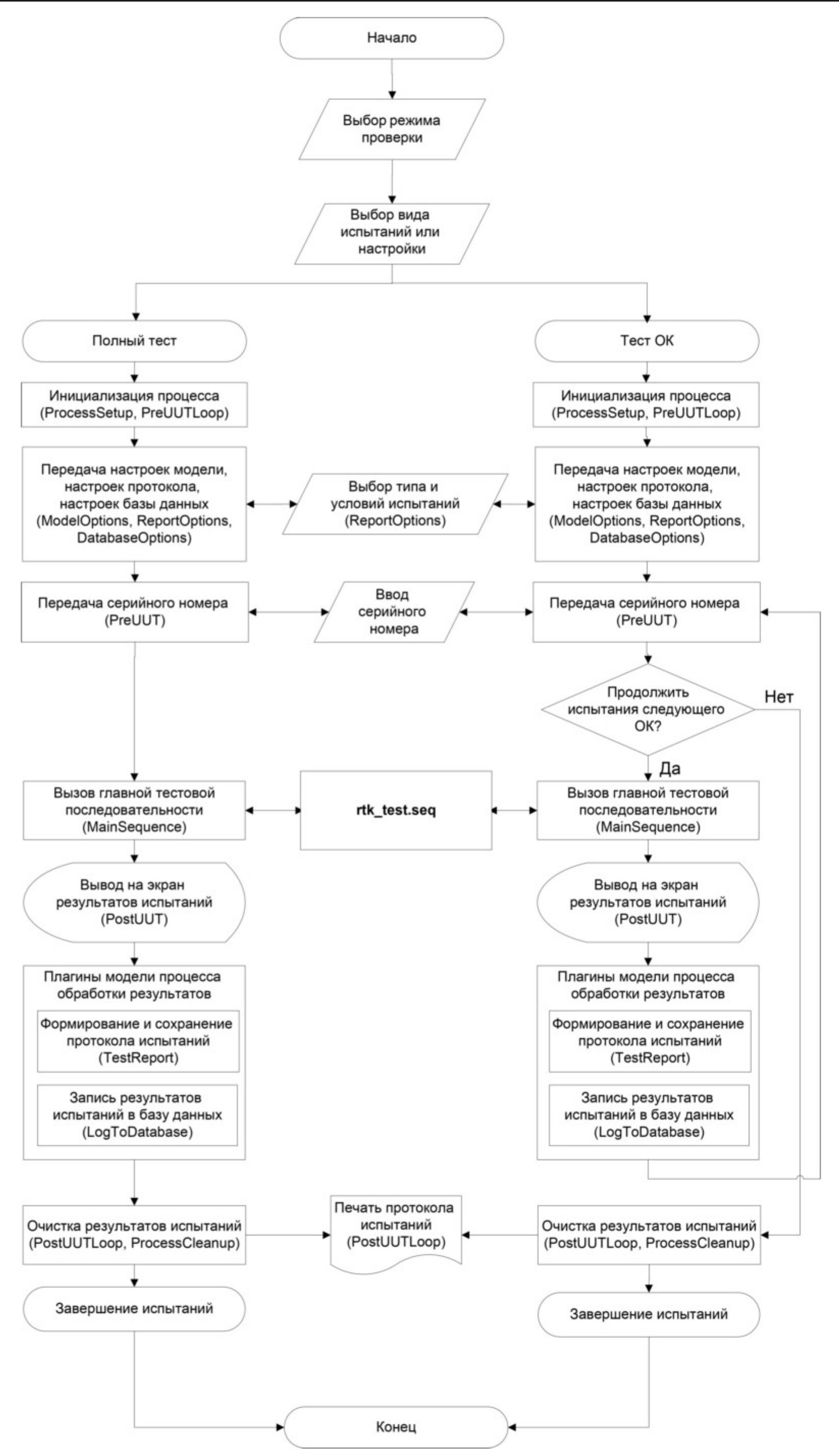 Тестовая последовательность разрабатывается с помощью среды для организации автоматизированного тестирования NI TestStand, а подпрограммы, управляющие режимами работы изделий, с помощью С/С++ и средствами графической разработки NI LabVIEW.