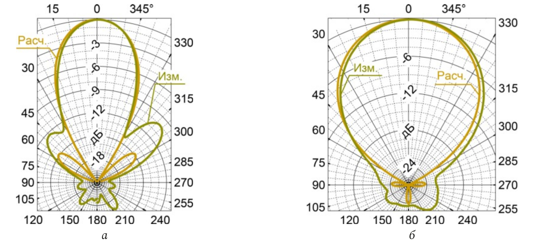 Рис. 6. ДН в горизонтальной (а) и вертикальной (б) плоскостях на частоте F0