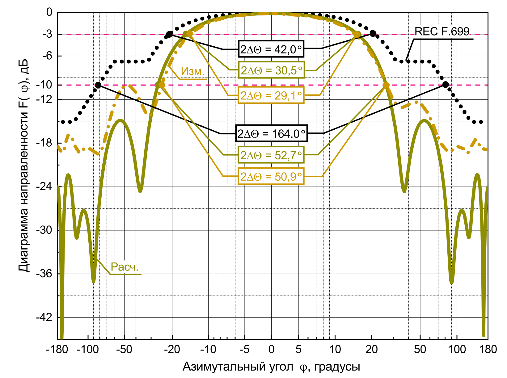 По ширине расчетные и измеренные ДН на начальной частоте Fl в вертикальной (рис. 15) и горизонтальной (рис. 14) плоскостях по уровню –3 дБ и –10 дБ превышают значения справочных диаграмм Рекомендаций МСЭ Rec. ITU-R F.699. На центральной и конечной частотах F0 и Fh в вертикальной (рис. 17, 19) и горизонтальной (рис. 16, 18) плоскостях расчетные и измеренные ДН удовлетворяют требованиям указанной рекомендации, в том числе и по уровню заднего излучения на всех трех рассматриваемых частотах.