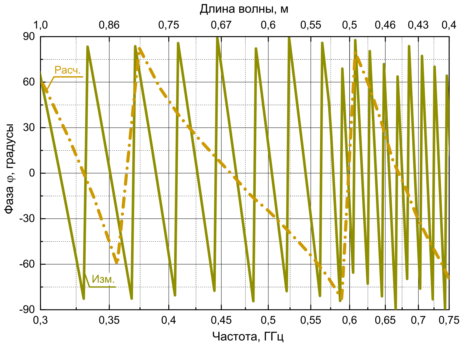 Осциллирующий характер входного сопротивления поясняется представленными на рис. 23 графиками нормированных относительно значений фазовой характеристики (ФХ) комплексного сопротивления. Экстремумы входного сопротивления располагаются на частотах, где ФХ меняет знак с положительного на отрицательный с периодом в 180°. Измеренные и расчетные значения реактивного сопротивления представлены на рис. 24, 25 в виде графиков.