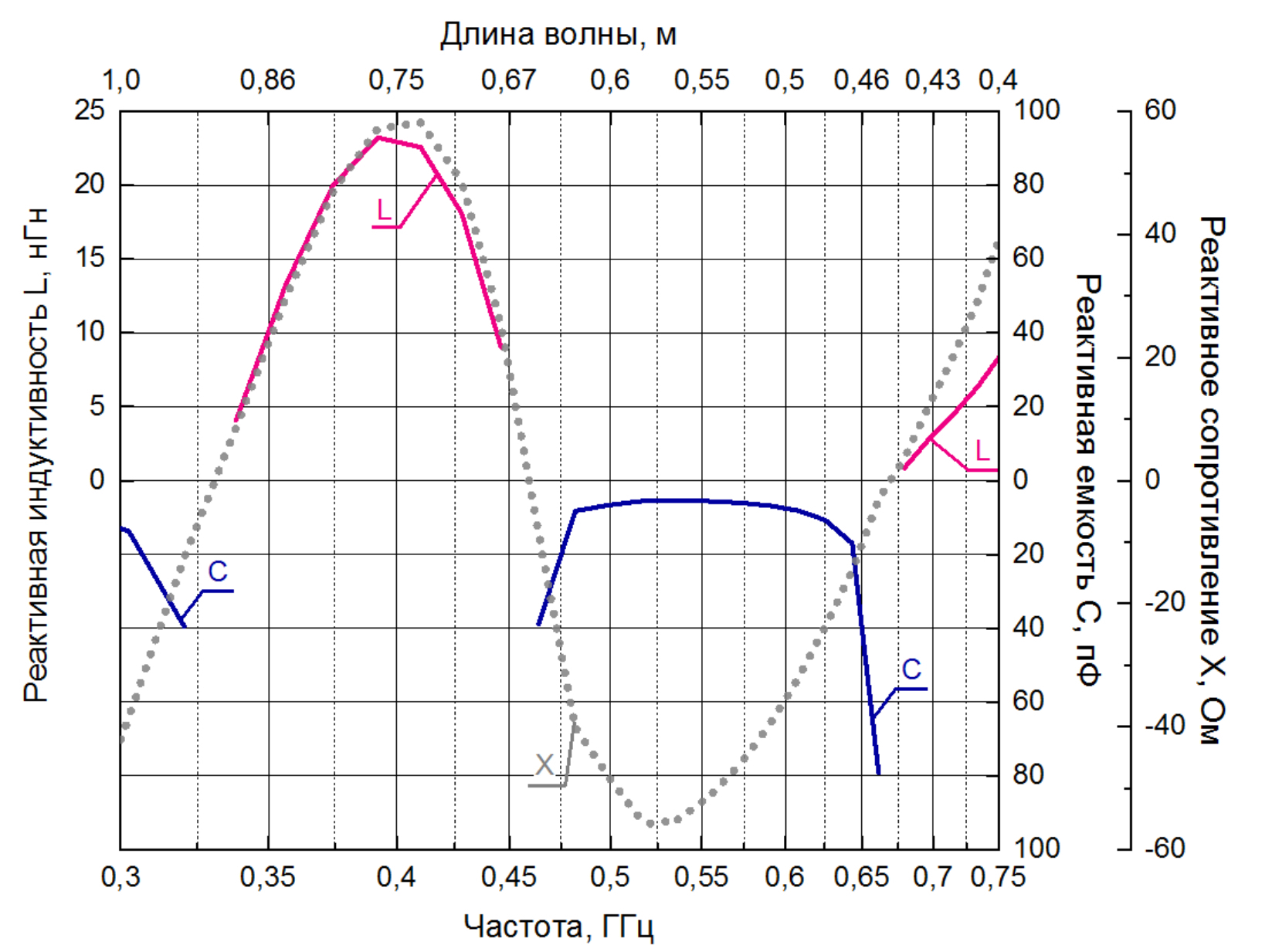 Как видно из графиков, реактивное сопротивление также имеет осциллирующий характер, где смена знака сопротивления происходит на частотах, соответствующих частотам смены знака ФХ. Амплитуда колебаний расчетного и измеренного реактивного сопротивления лежит в пределах Ом. Предельные измеренные значения рективной индуктивности плавно снижаются по мере увеличения частоты с 25 до 10 нГн, а предельные значения реактивной емкости с 4,5 нФ практически до нуля. Амплитуда колебаний сглаженной функции измеренного реактивного сопротивления стемится к нулю на всем участке рассматриваемого диапазона, что указывает на хорошее согласование антенны практически во всей, рассматриваемой полосе частот.