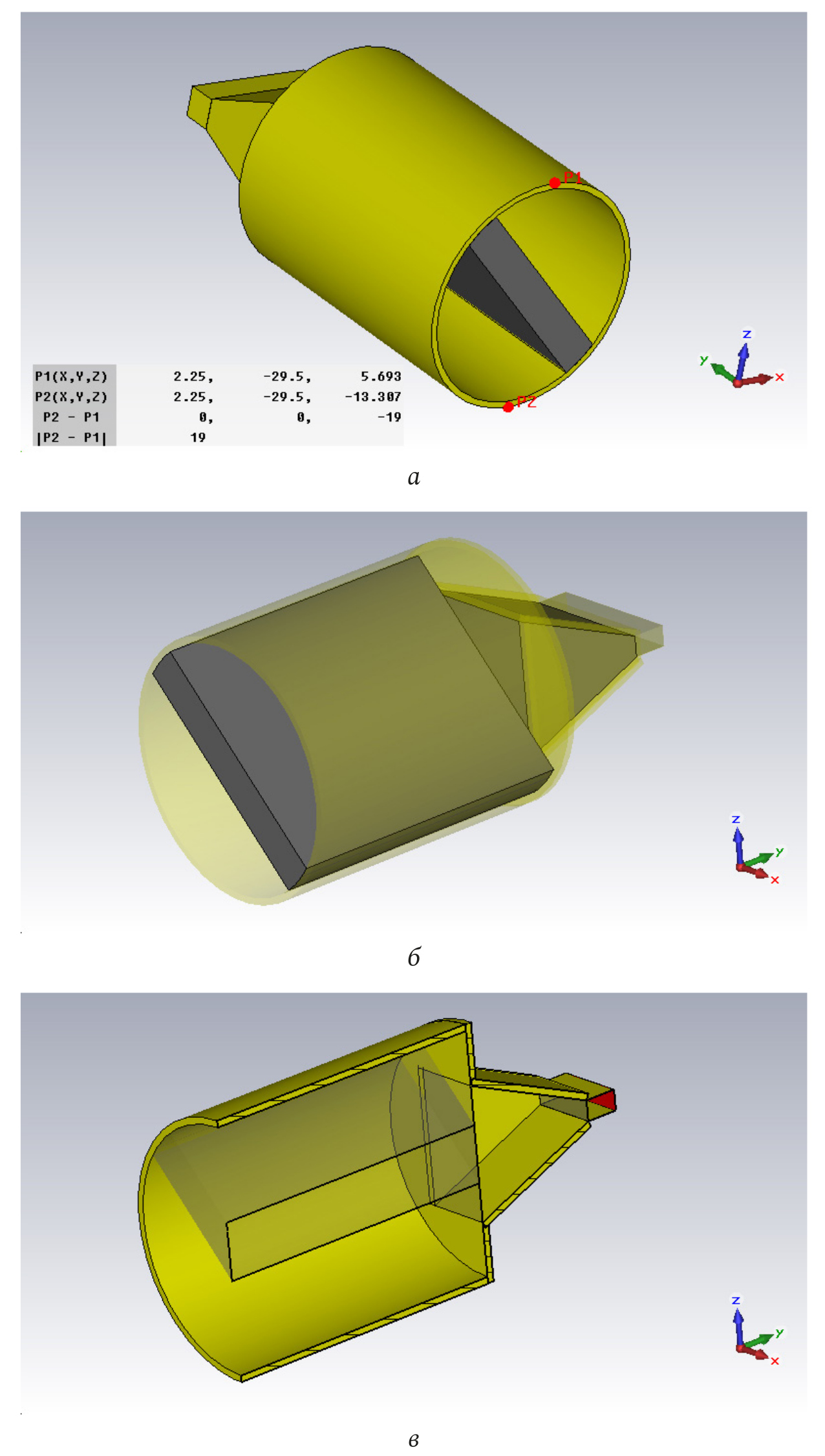 На рис. 1 показана модель антенного элемента, построенного на основе круглого волновода с внутренним диаметром 18 мм и диэлектрической пластиной, плоскость которой ориентирована под углом 45° к силовым линиям вектора напряженности электрического поля. Круглый волновод запитывается с помощью линейно расширяющегося перехода от прямоугольного волновода к квадратному волноводу, полностью заполненного диэлектриком – полистиролом, для реализации необходимой пространственной ориентации пластины в круглой части волновода, а также для уменьшения отражений от стыка квадратного и круглого волноводов.