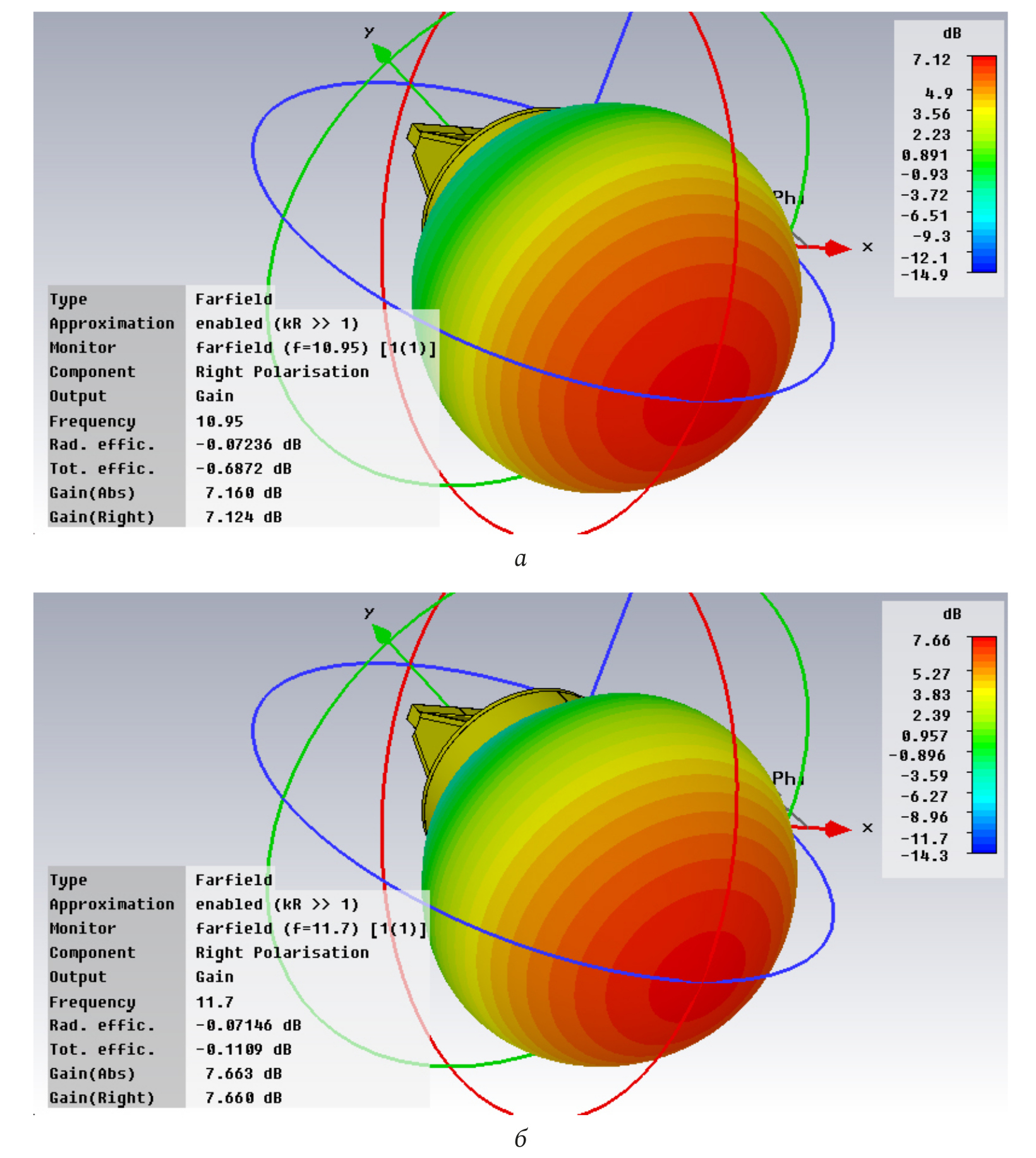 Рис. 3. ДН антенны на правой круговой поляризации: а – ДН на правой круговой поляризации на частоте 10,95 Гц; б – ДН на правой круговой поляризации на частоте 11,7 Гц