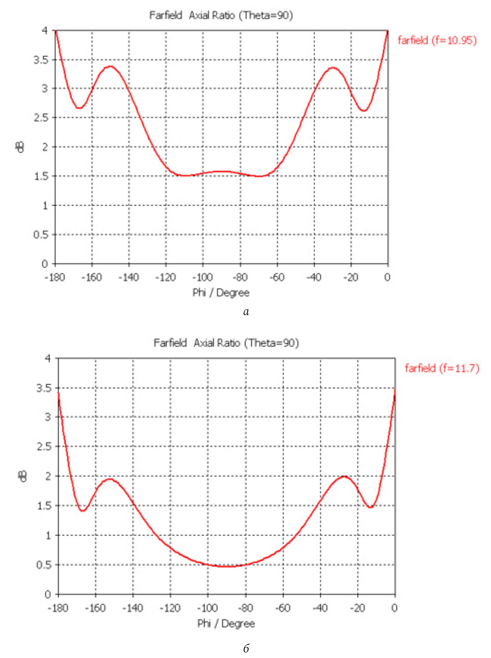 На нижней частоте 10,95 ГГц анализируемого диапазона осевое отношение эллипса поляризации не превышает 3 дБ в секторе углов шириной 90° (рис. 4, а); на верхней частоте 11,7 ГГц анализируемого диапазона отношение эллипса поляризации не превышает 3 дБ почти во всем полусферическом пространстве (рис. 4, б).