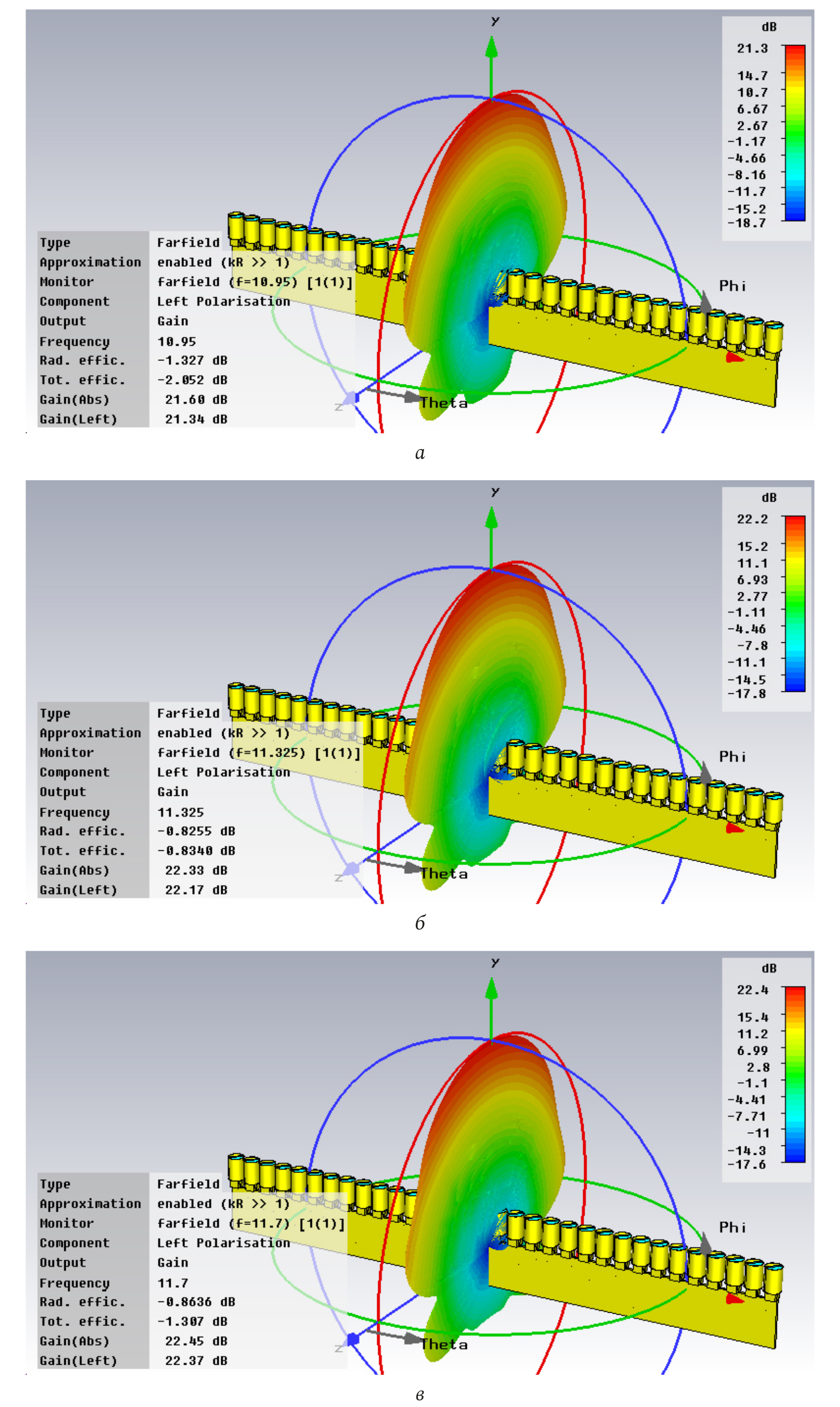 Результаты. Показано, что коэффициент усиления на частоте 10,95 ГГц – 32,5 дБ (по нормали) и 31,2 дБ – при отклонении луча на ±37,5° в угло-местной плоскости; коэффициент усиления на частоте 11,7 ГГц – 33,8 дБ (по нормали) и 32,5 дБ – при отклонении луча на ±37,5° в угло-местной плоскости. При максимальном отклонении главного лепестка от нормали уровень боковых лепестков в вертикальной повышается до уровня –11,4 дБ, что незначительно превышает УБЛ при синфазном и равноамплитудном распределении поля в апертуре ФАР (–13,2 дБ).