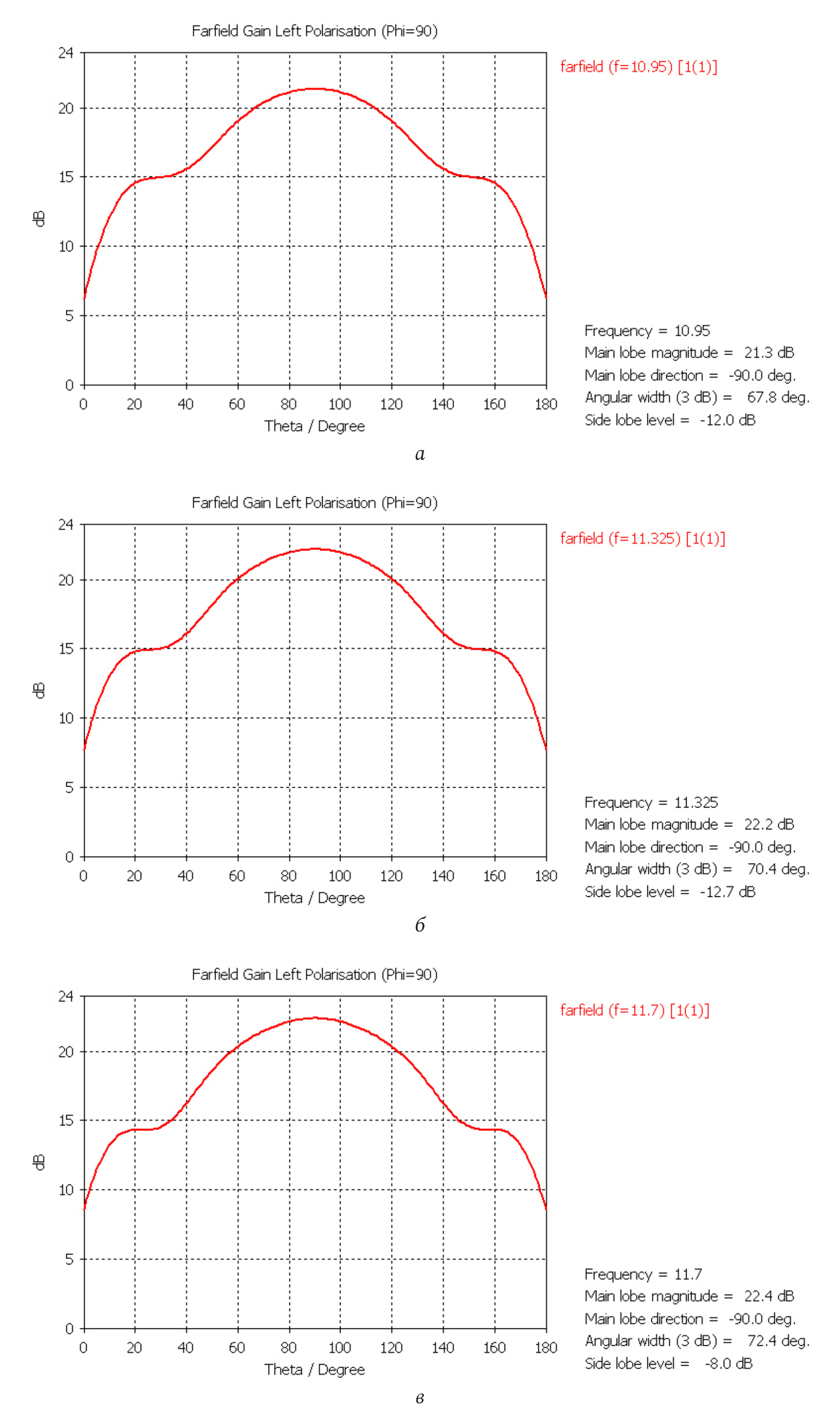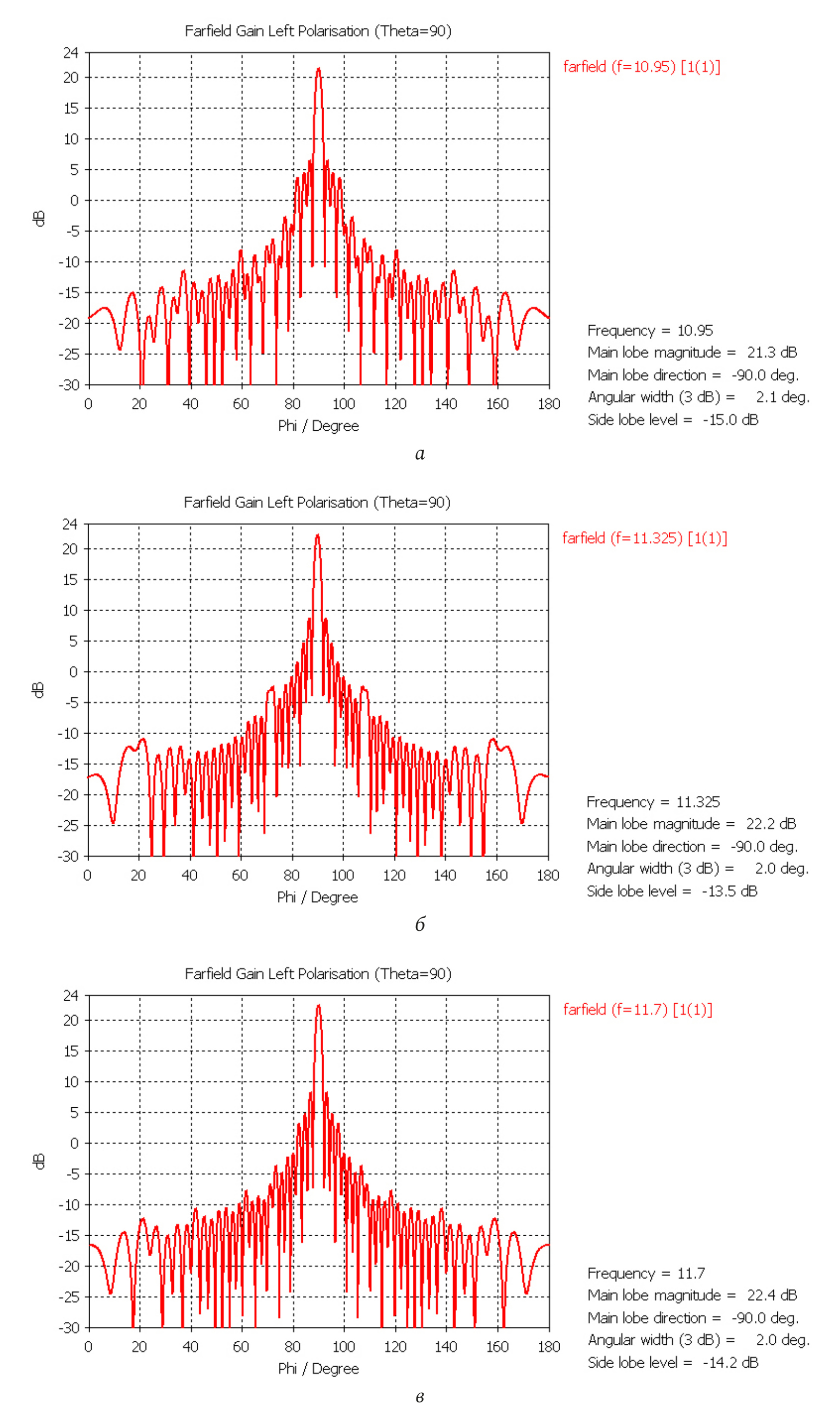 Уровень боковых лепестков диаграммы направленности в азимутальной плоскости (рис. 6) на всех частотах лучше, чем у синфазного и равноамплитудного раскрывов эквивалентных размеров (–13,2 дБ).