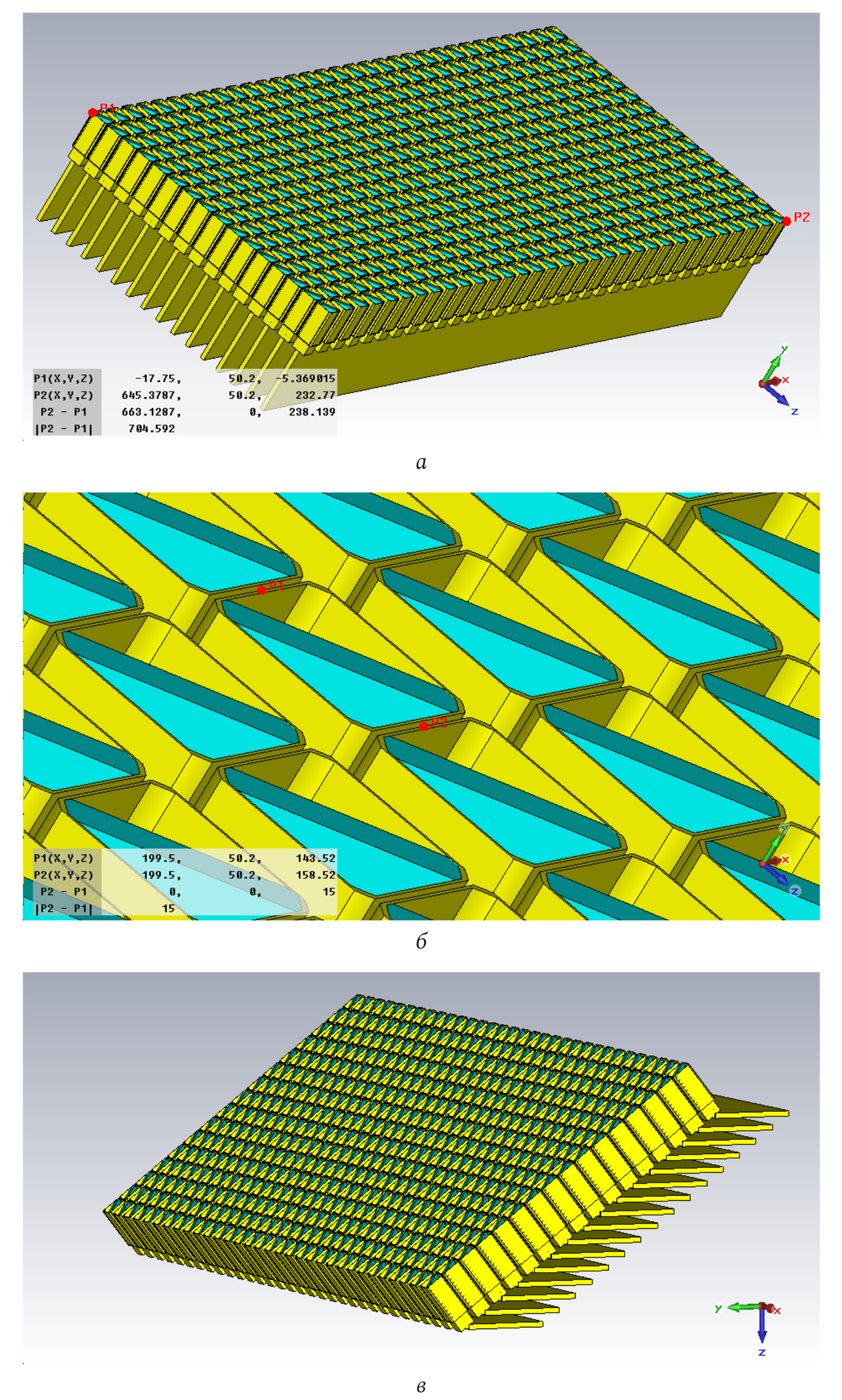 Рис. 9. Модель плоской антенной решетки, составленной из 16 линейных антенных решеток: а – плоская антенная решетка из 32 × 16 элементов, составленная из 16 линейных антенных решеток. Размеры апертуры – 665,5 × 238 мм2; б – период в угло-местной плоскости – 15 мм (уменьшен с целью снижения уровня боковых лепестков при широкоугольном сканировании); в – ФАР с 32 × 16 элементов с делителями мощности, расположенными горизонтально. Апертура ФАР наклонена на угол 37,5 градусов в угло-местной плоскости. Высота модифицированной ФАР – 175 мм. Глубина ФАР с делителями мощности – 262 мм. Ширина ФАР – 665,5 мм