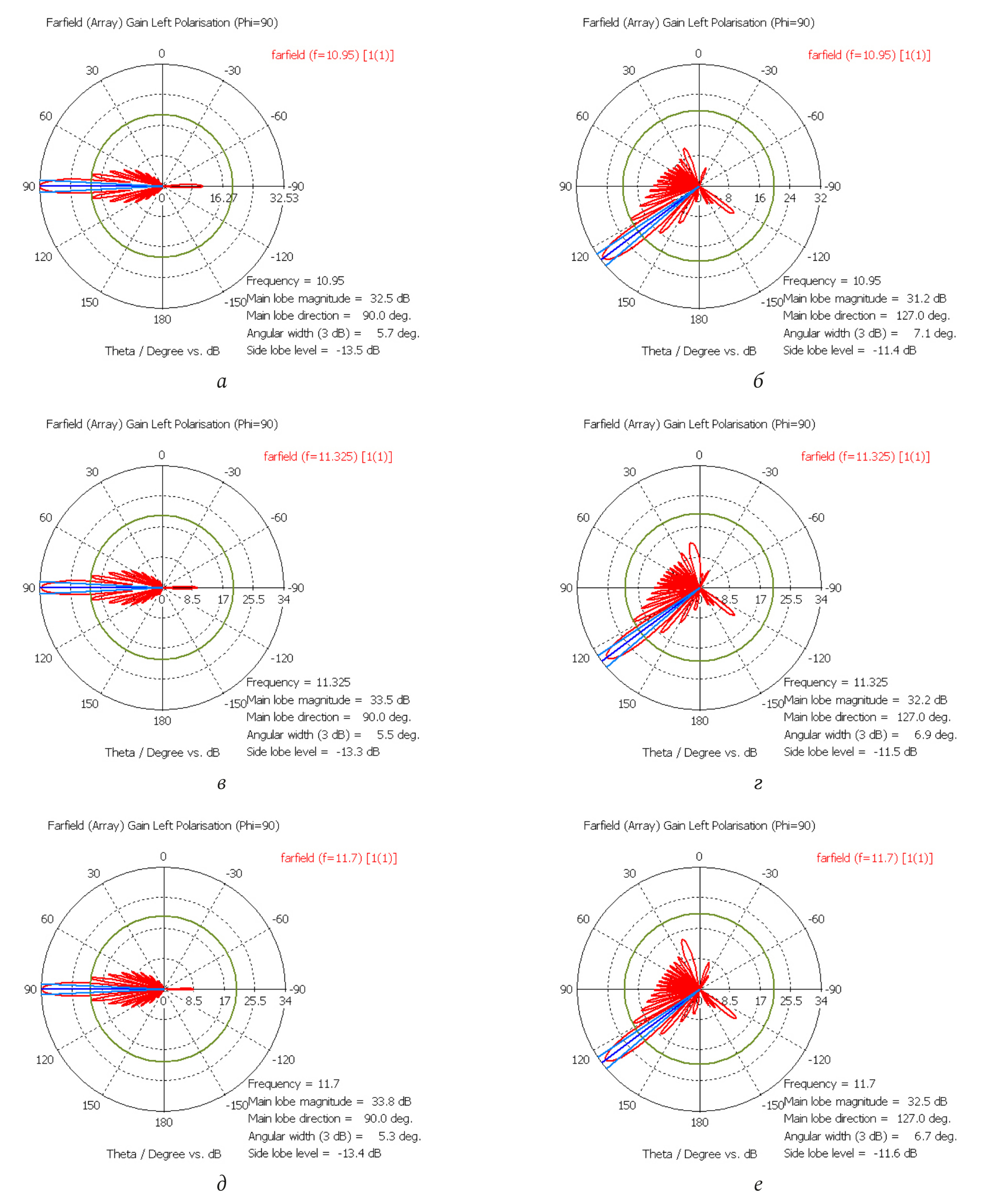 Рис. 10. Диаграммы направленности в вертикальной плоскости плоской антенной решетки, составленной из 16 линейных антенных решеток: а – ДН в вертикальной плоскости ФАР 32 × 16 элементов при излучении по нормали к апертуре ФАР, частота – 10,95 ГГц; б – ДН в вертикальной плоскости ФАР 32 × 16 элементов при излучении под углом 37,5 градуса к нормали к апертуре ФАР, частота – 10,95 ГГц; в – ДН в вертикальной плоскости ФАР 32 × 16 элементов при излучении по нормали к апертуре ФАР, частота – 11,325 ГГц; г – ДН в вертикальной плоскости ФАР 32 × 16 элементов при излучении под углом 37,5 градуса к нормали к апертуре ФАР, частота – 11,325 ГГц; д – ДН в вертикальной плоскости ФАР 32 × 16 элементов при излучении по нормали к апертуре ФАР, частота – 11,7 ГГц; е – ДН в вертикальной плоскости ФАР 32 × 16 элементов при излучении под углом 37,5 градуса к нормали к апертуре ФАР, частота – 11,7 ГГц