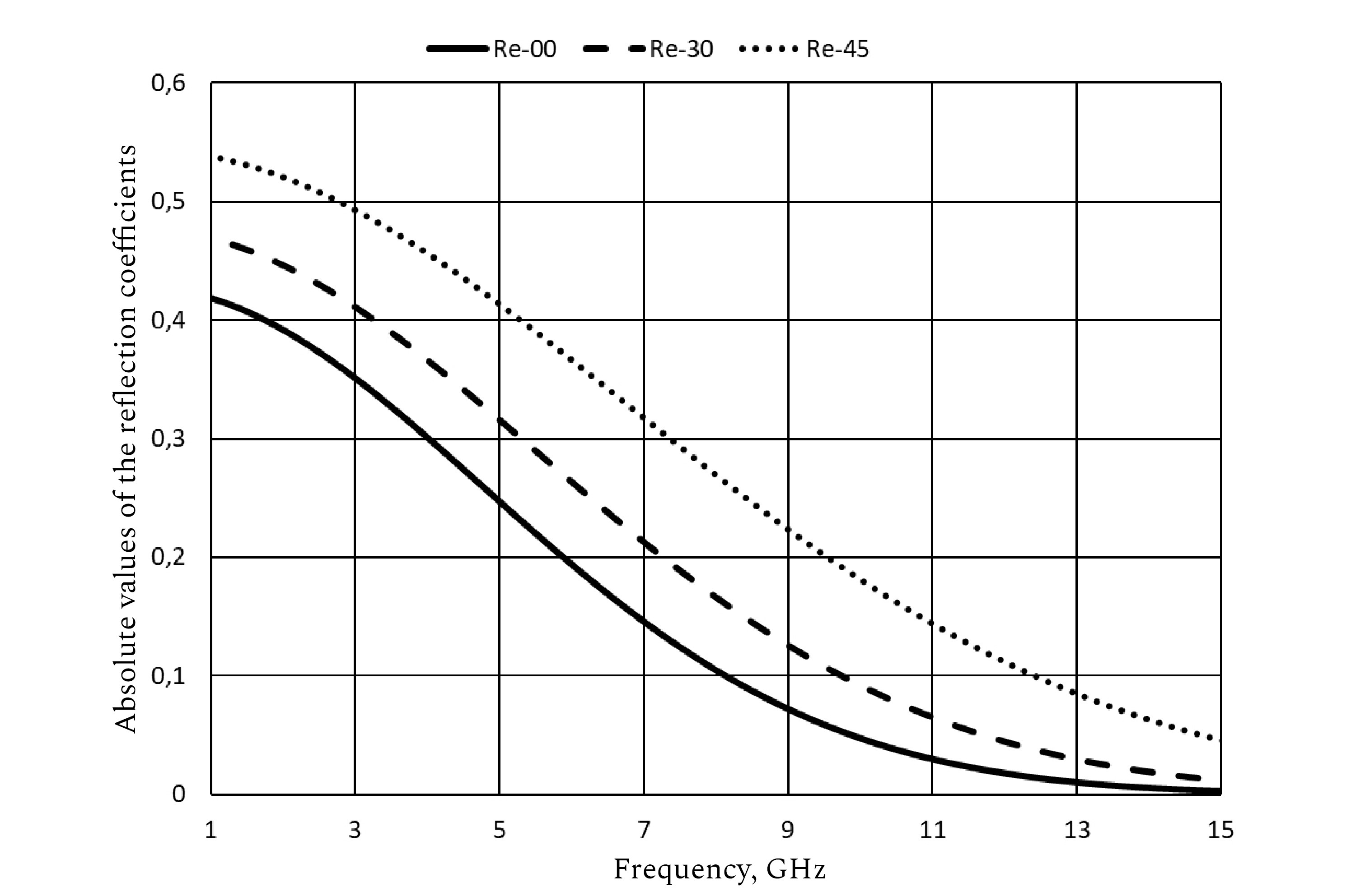 From the graphs presented in Figs. 7, 8, it can be seen that in the case of horizontal polarization with increasing angle of incidence there is an increase in the level of reflection of the electromagnetic wave, and in the case of vertical polarization the Brewster phenomenon is clearly manifested at an angle of incidence of 74°.