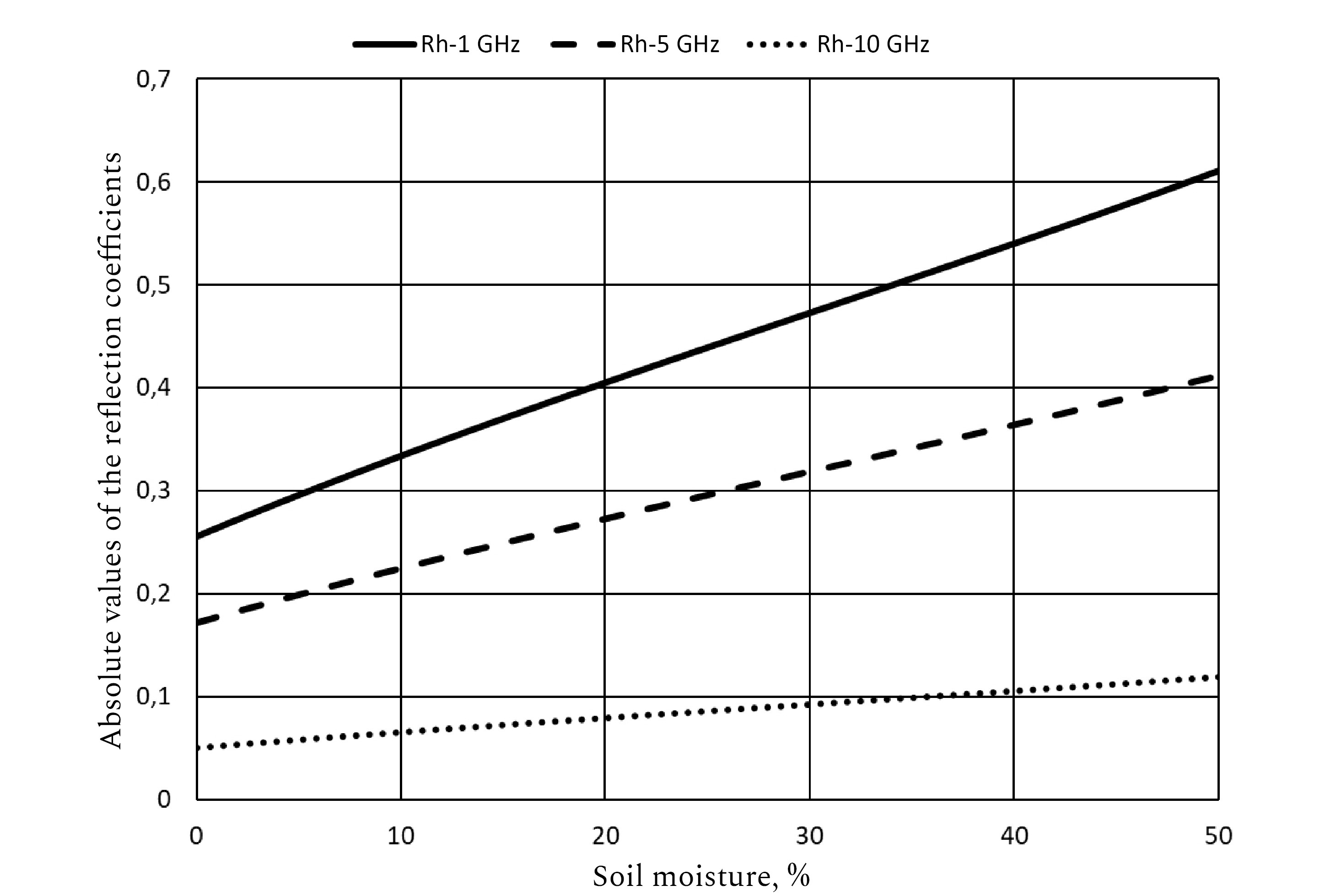 Calculations were carried out in the range of soil moisture variation up to 50 %. From the graphs presented in Figs. 5, 6, it can be seen that with increasing soil moisture the level of reflection smoothly increases.