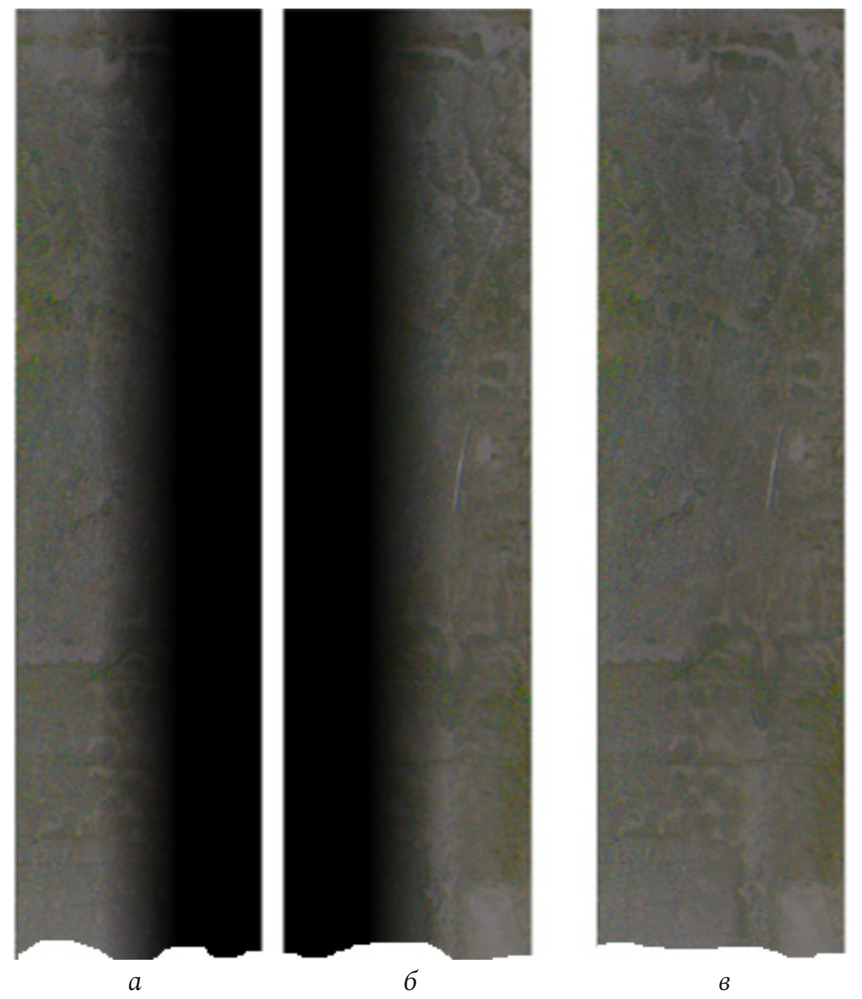Представленный в статье алгоритм и его экспериментальное исследование показали эффективность принятых решений. В результате на сформированном панорамном изображении отсутствуют визуально заметные яркостные артефакты, которые могут приводить к ошибкам обнаружения дефектов на внутренней поверхности.