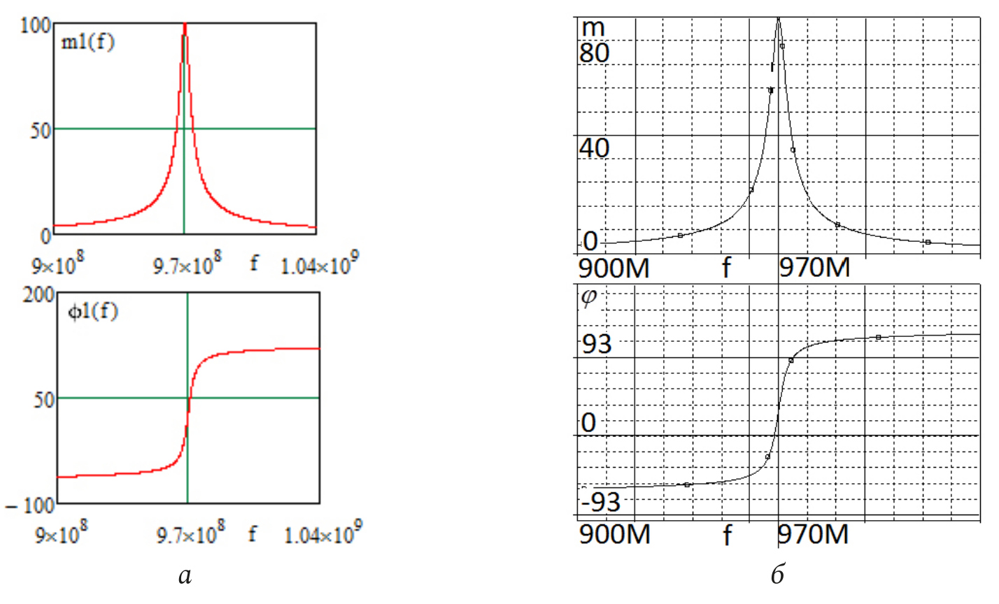 Fig. 8. Frequency characteristics (frequency response and phase response) of the equivalent circuit (Fig. 7), obtained in the MathCad (a) and OrCad (b) systems