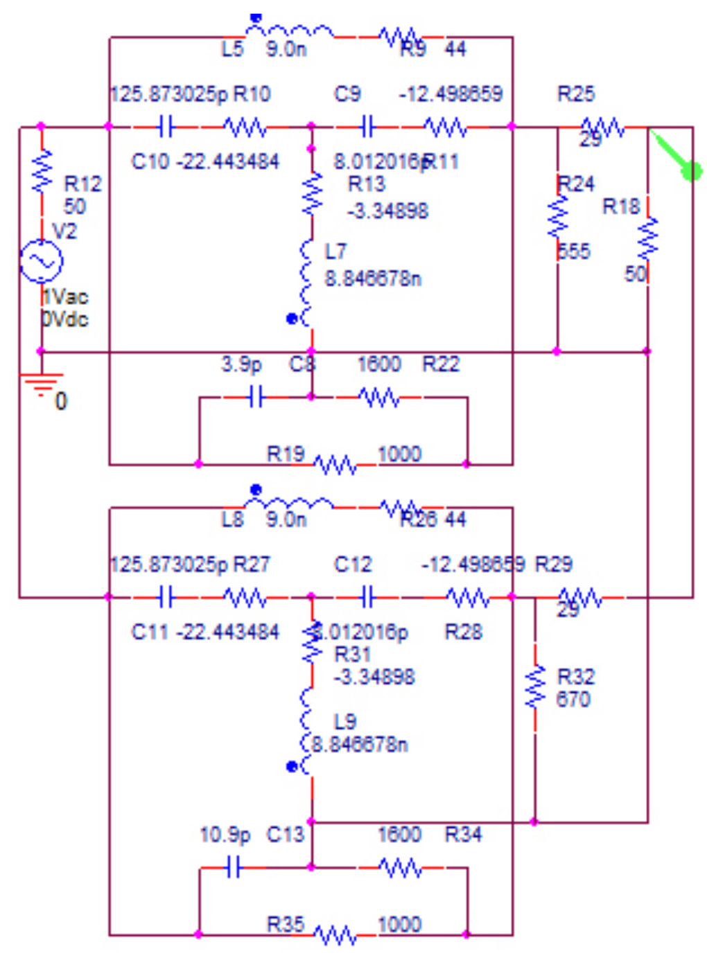 Схема НЧ реализована в виде параллельно соединенных эквивалентной схемы нелинейного элемента и цепи обратной связи из П-образного соединения трех элементов – Параметры ЦОС заданы произвольно. Схема РЧ собрана на основе Г-образного соединения двух элементов –