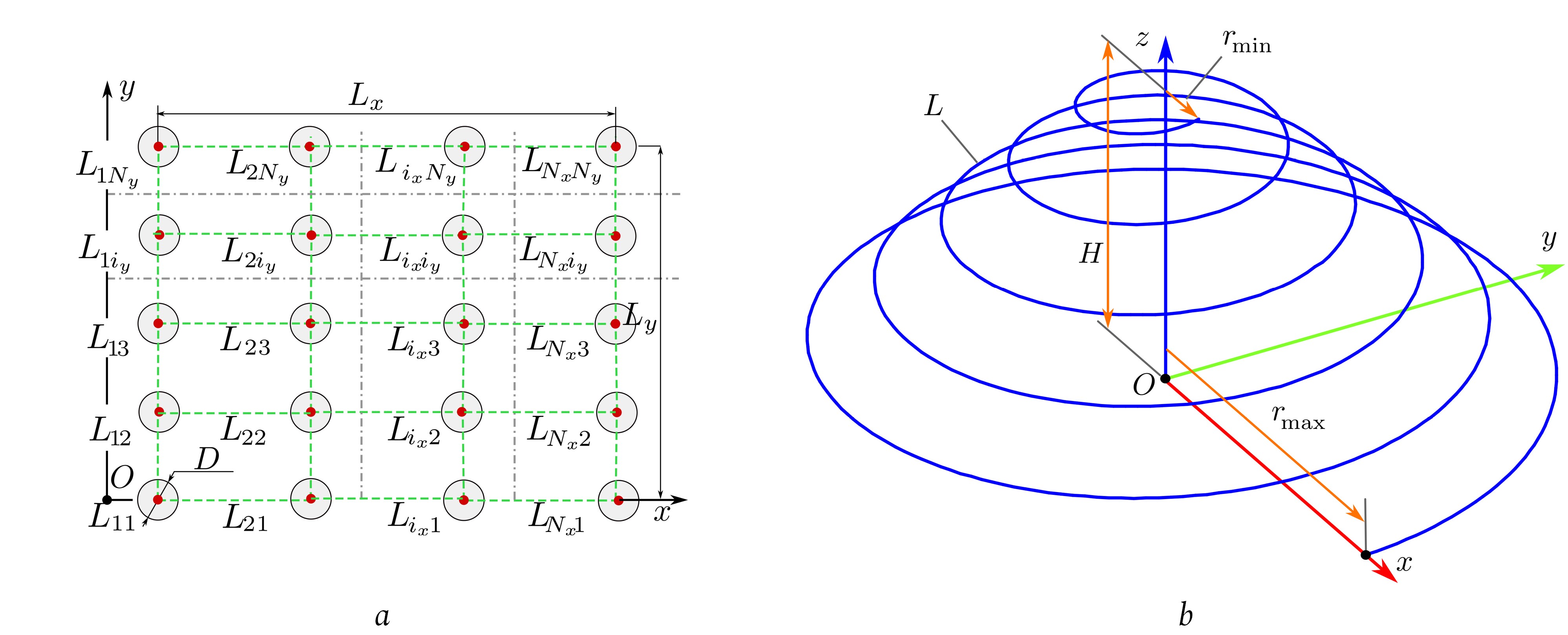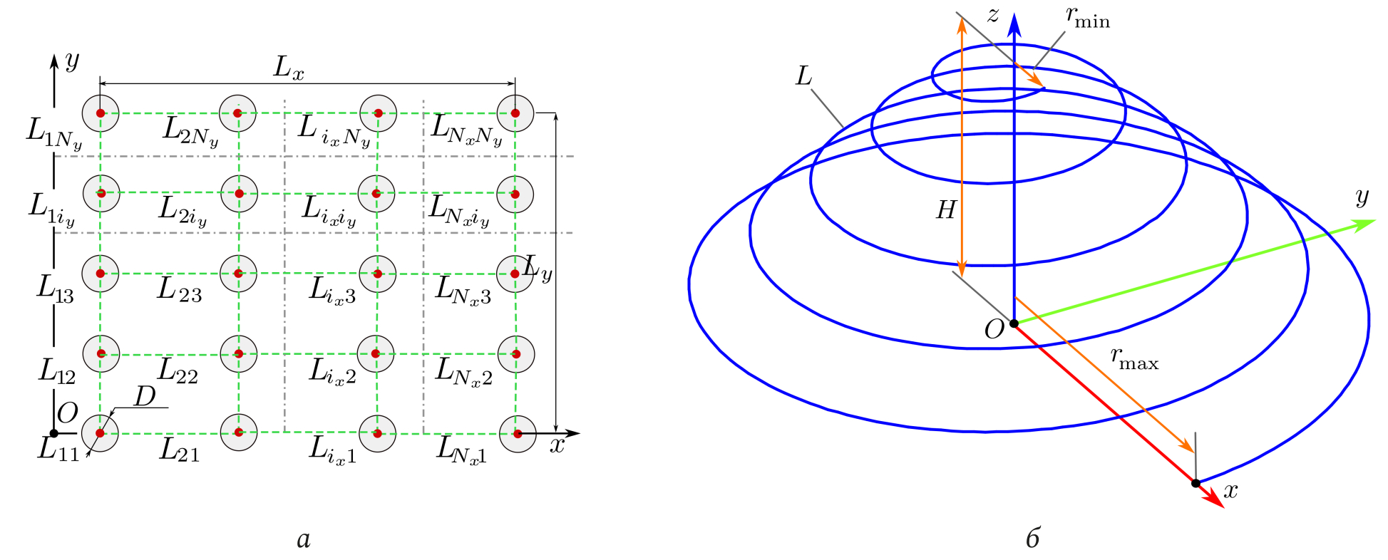 Элементы метаструктуры – конические спирали, образованные идеальным проводником, имеющим круглое сечение. Ось каждой спирали спирали параллельна оси Сам элемент показан на рис. 1, б. Минимальный радиус спирали – максимальный радиус спирали – Высота спирали равна число витков обозначим как Осью спиральных элементов будем считать линию, совпадающую с осью Диаметр проводников существенно меньше и существенно меньше размера спиралей и межвиткового расстояния. Это позволяет использовать тонкопроволочное приближение при построении модели метаструктуры (выражения, приведенные в предыдущем разделе).