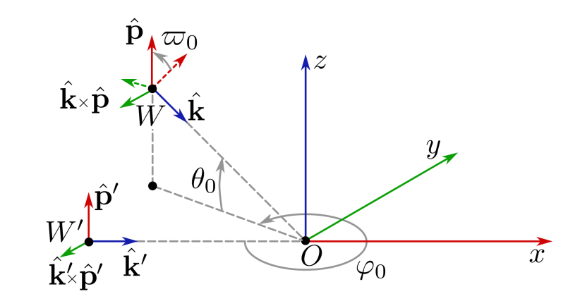 Рис. 2. Связь плоской электромагнитной волны с первичной волной и глобальной декартовой системой координат