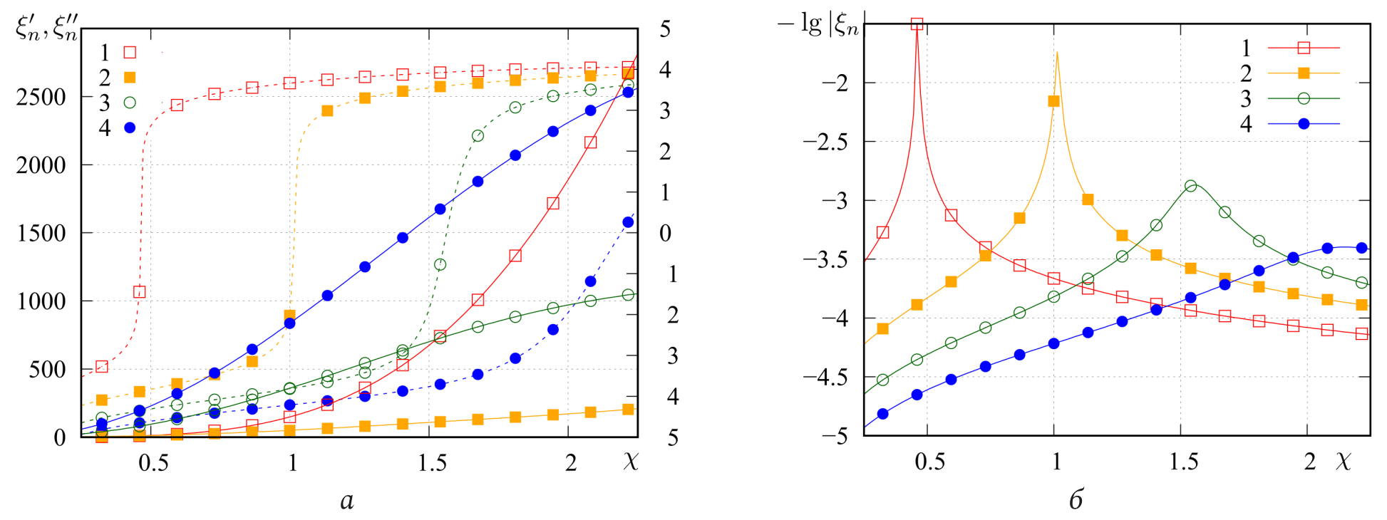 На рис. 3 представлены зависимости (а) и от (б), индекс соответствует номеру кривой на графиках. Приведенные графики показывают, что зависимость СЧ от частоты имеет резонансный характер, и в рассматриваемом диапазоне мы наблюдаем четыре резонанса. Эти резонансы можно классифицировать как тонкопроволочные вследствие близкого соответствия значениям При этом графики показывают, что резонанс для первой собственной функции наступает при несколько меньшем, чем а резонансы для последующих собственных функций возникают для значений больших, чем причем с ростом отклонения в большую сторону возрастают. Этот момент можно понять, если представить каждую собственную функцию в виде суперпозиции пары бегущих волн, распространяющихся по проводнику во взаимно противоположных направлениях. В этом случае становится очевидным, что фазовая скорость данных волн для будет меньше скорости света, а для – больше скорости света. Рост фазовой скорости, в свою очередь, связан с увеличением межвиткового взаимодействия, которому способствуют рост и особенности форм высших собственных функций. Также здесь можно отметить, что добротность резонансов довольно быстро падает с ростом n.
