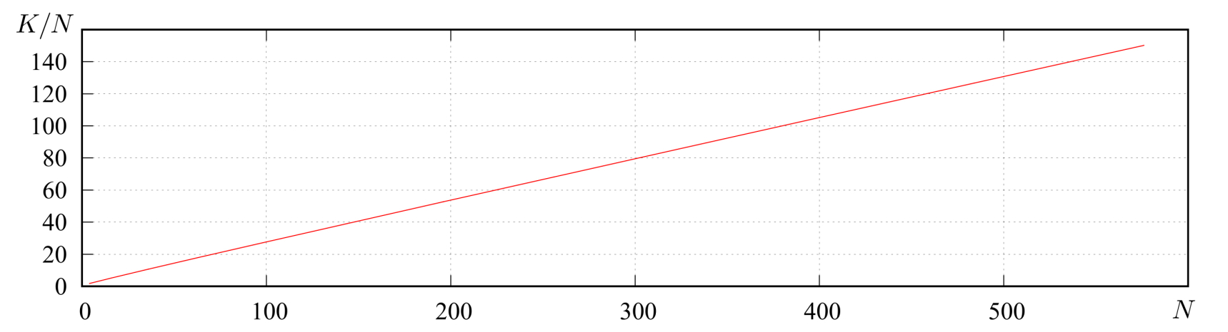 Геометрия решетки определяется структуры четырьмя параметрами: расстояниями между соседними узлами решетки и вдоль соответствующих осей координат и числом элементов вдоль соответствующих осей. Отношение обозначим символом . При численном моделировании предполагалось, что Рассматривались структуры с Общее число элементов подобных структур определяется как Для рассматриваемой структуры параметры и связаны соотношением: 0,53, при этом данное соотношение, по сути, является коэффициентом заполнения структуры элементами. При соседние элементы структуры вплотную примыкают друг к другу. Исследования проводились в диапазоне Сходимость итерационного процесса в нашем случае зависит только от и Коэффициент сжатия зависит только от На рис. 5 показан график зависимости коэффициента сжатия от числа элементов структуры N. Видно, что данная зависимость является линейной, и может быть приближенно описана функцией Отметим, что при непосредственном расчете матричных элементов данная зависимость является квадратичной. Таким образом, предложенный алгоритм расчета элементов блочной матрицы позволяет существенно сократить затраты машинной памяти и машинного времени.