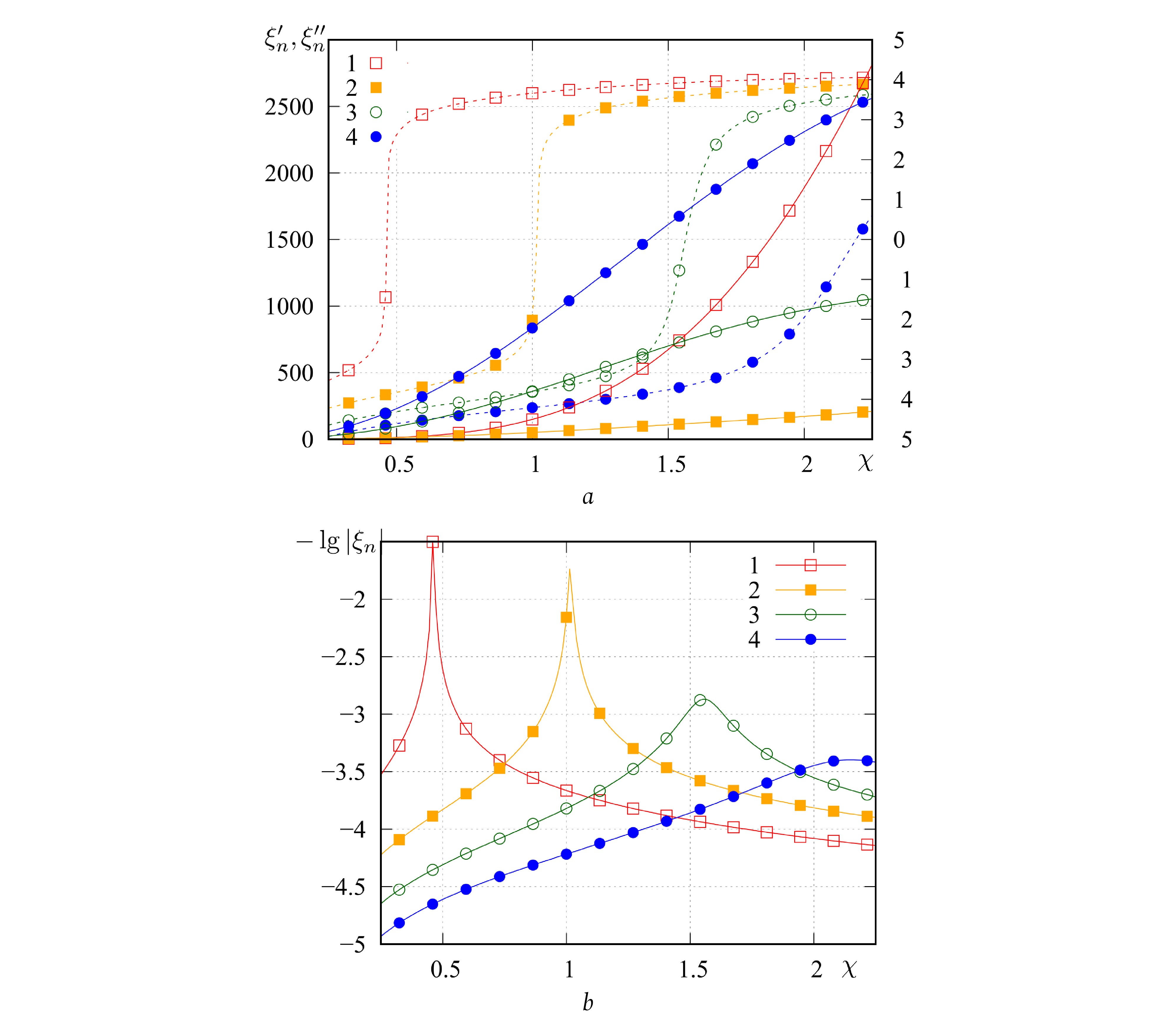Fig. 3. Dependence (solid curves, a), (dashed curves, a) and (b) from marker (line) number corresponds to number eigenvalue