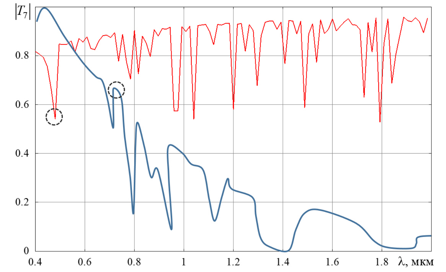На рис. 2 показана зависимость модуля коэффициента прохождения оптической волны от длины волны в области 7 (красная линия). Как видно из рис. 2, наблюдается ряд резонансных минимумов прохождения оптической волны, что соответствует концентрации энергии внутри многослойной киральной структуры на некоторых дискретных длинах волн спектра солнечного излучения. При этом энергия оптической волны концентрируется внутри многослойной структуры. На этом же рисунке в нормированных переменных приведен спектр солнечного излучения (синяя линия).