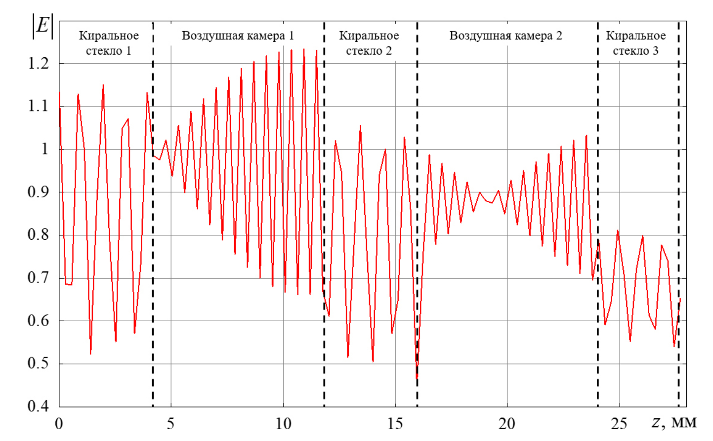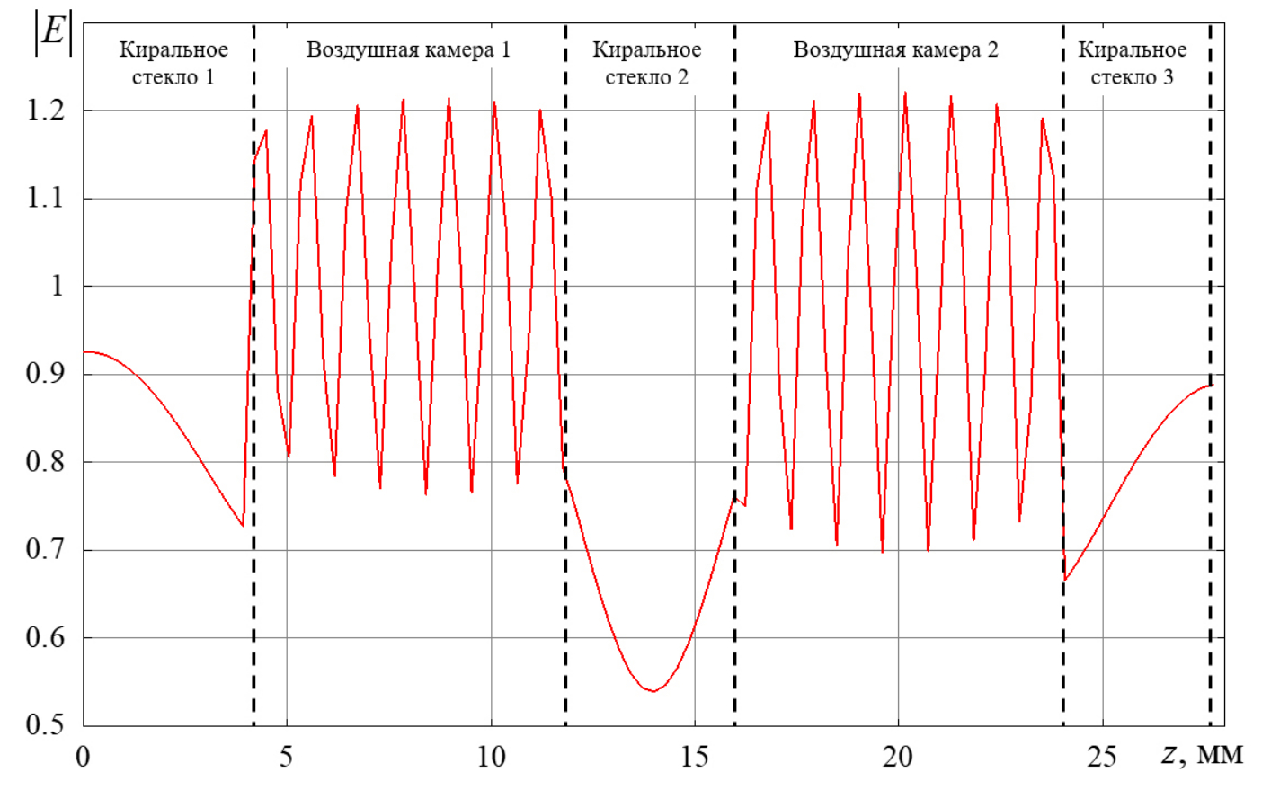 Таким образом, для рассматриваемой многослойной киральной метаструктуры на основе киральных кварцевых стекол с 10 %-процентным легированием ниобата лития наиболее эффективной является частотно селективная концентрация оптической энергии на длине волны 0,74 мкм: концентрируется по 11 % (от падающей энергии на стеклопакет) оптической энергии в каждой из двух воздушных камер.