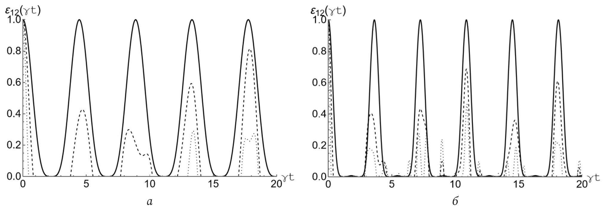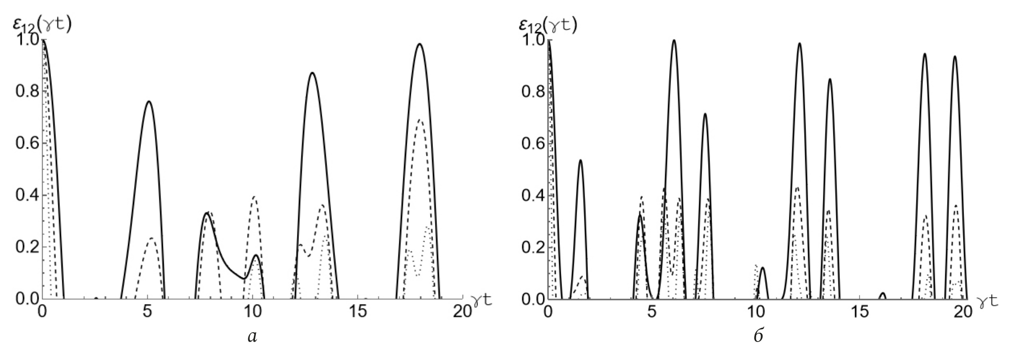 На рис. 4, a построена зависимость параметра перепутывания для кубитов и от безразмерного времени для бисепарабельного начального состояния кубитов (3) с и различных значений среднего числа фотонов в моде резонатора. Для сравнения, на рис. 4, б представлены аналогичные зависимости для модели, состоящей из трех кубитов в общем резонаторе. При усреднении по состояниям третьего кубита, как и в случае начального состояния (2), кубиты и в начальный момент времени максимально перепутаны. Сравнение рис. 1 и 4 выявляет, что для начального состояния кубитов (3) существенно возрастает длительность временных интервалов, на которых состояния кубитов распутаны, а также присутствует эффект мгновенной смерти перепутывания даже в случае малых интенсивностей теплового поля. На рис. 5, a отражена зависимость параметра перепутывания для кубитов и от безразмерного времени для бисепарабельного начального состояния кубитов (3) с и различных значений интенсивностей поля резонатора. Видно, что в случае малых интенсивностей теплового поля присутствует эффект мгновенной смерти перепутывания в отличие от аналогичной пары кубитов для начального состояния (2). На рис. 5, б приведены аналогичные зависимости для модели с тремя кубитами в резонаторе. Для рассматриваемых кубитов и начальное состояние является сепарабельным, для которого Для состояния (3) максимальная степень перепутывания кубитов для модели с тремя кубитами в общем резонаторе также существенно меньше соответствующей величины для модели с двумя кубитами в резонаторе. Для кубитов и существенно возрастают промежутки времени, для которых перепутывание кубитов и отсутствует. Наиболее интересными представляются расчеты отрицательности пары кубитов и для начального бисепарабельного состояния (3). Указанные расчеты указывают на отсутствие в рассматриваемой модели перепутывания кубитов в процессе их эволюции при любых интенсивностях теплового поля. В то время как для модели с тремя кубитами в общем резонаторе поведение отрицательности тех же кубитов и полностью аналогично поведению отрицательности кубитов и .