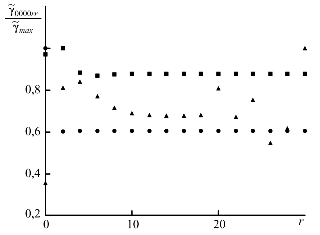 Fig. 1. Dependence of the normalized to the maximum value of the reduced overlap integral on the mode number of the object wave at (●), 10 (■), 50 (▲)