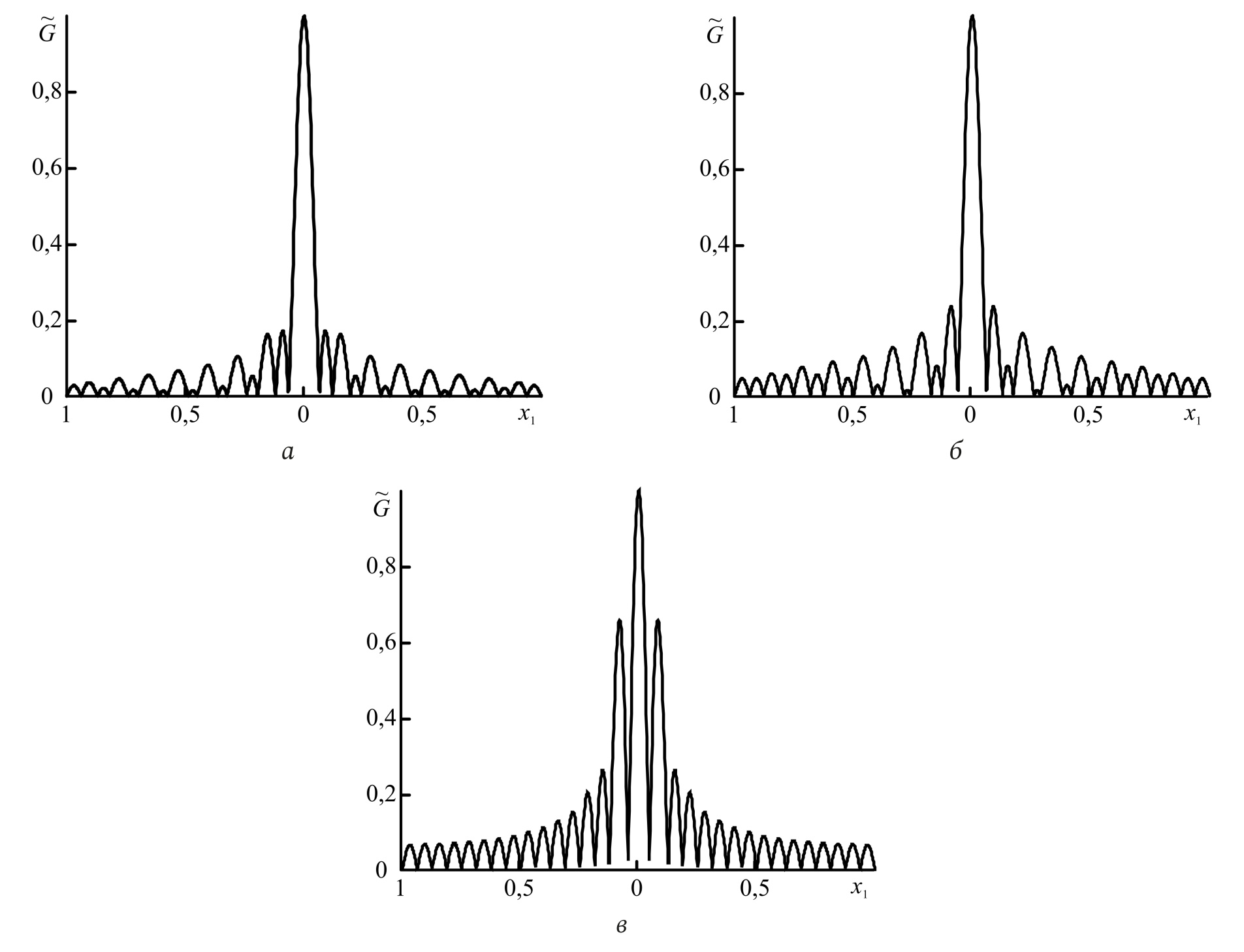 Рис. 2. Зависимость нормированного модуля ФРТ от поперечной координаты при (а), 102 (б), 104 (в)