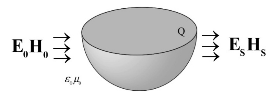 Полное электромагнитное поле в точке можно представить как сумму двух компонент: падающего поля , и поля , , рассеянного от объекта (рис. 1):
