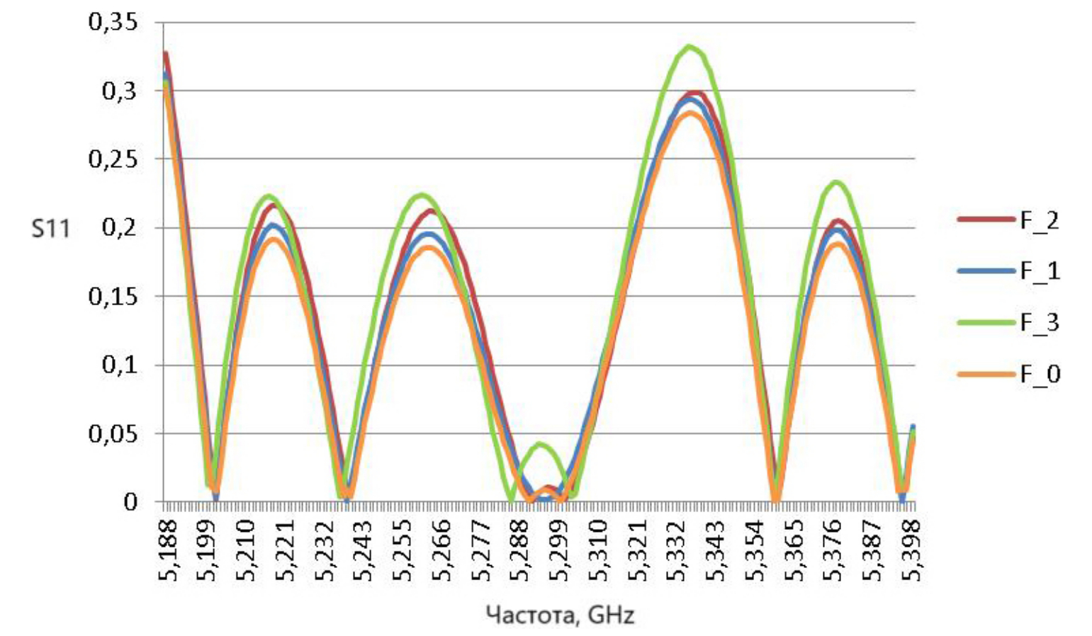 Рис. 4. Значение параметра S11 для объектов F0, F1, F2, F3