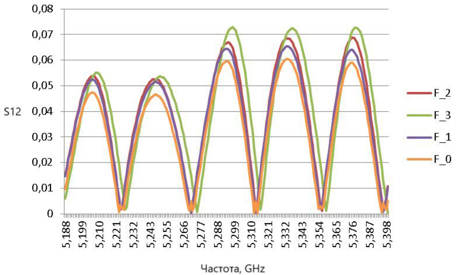 Рис. 5. Значение параметра S12 для объектов F0, F1, F2, F3