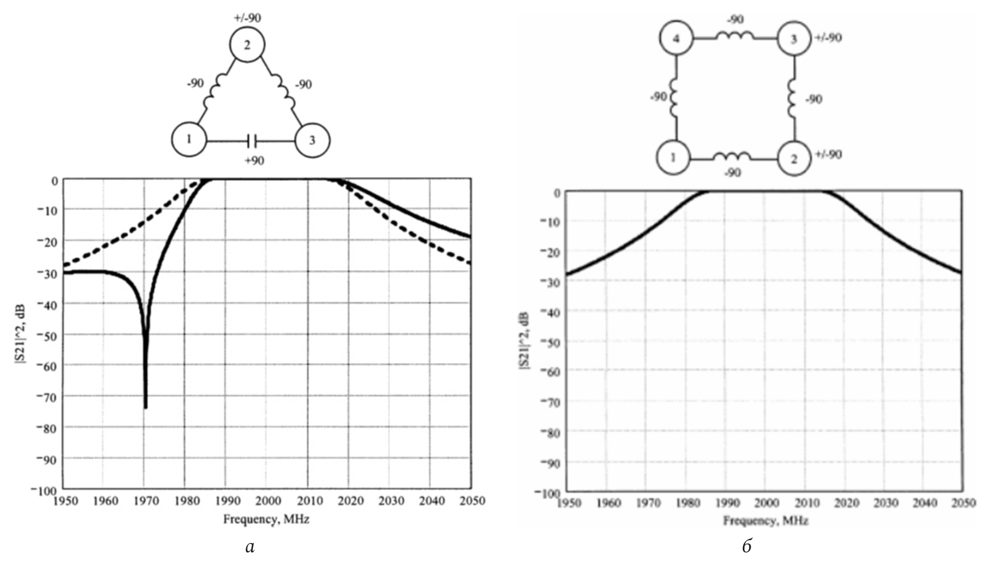 На рис. 2, б показан вариант с четырьмя резонаторами, известный как каскадно-квадруплетная секция с индуктивной перекрестной связью. Первичный путь в этом случае 1–2–3–4, вторичный путь 1–4, таким образом, обходит два резонатора. Нули передачи не образуются ни на каких реальных частотах выше или ниже полосы пропускания. Однако на мнимых частотах могут образовываться нули, что приводит к сглаживанию групповой задержки в полосе пропускания. Сглаживание групповой задержки также приводит к сглаживанию вносимых потерь. Потери в средней полосе немного увеличиваются, а эффекты спада на краях полосы уменьшаются. Эти эффекты неочевидны из данного анализа, более подробный анализ фильтров с нулями передачи на мнимых частотах приведен в [8; 9].