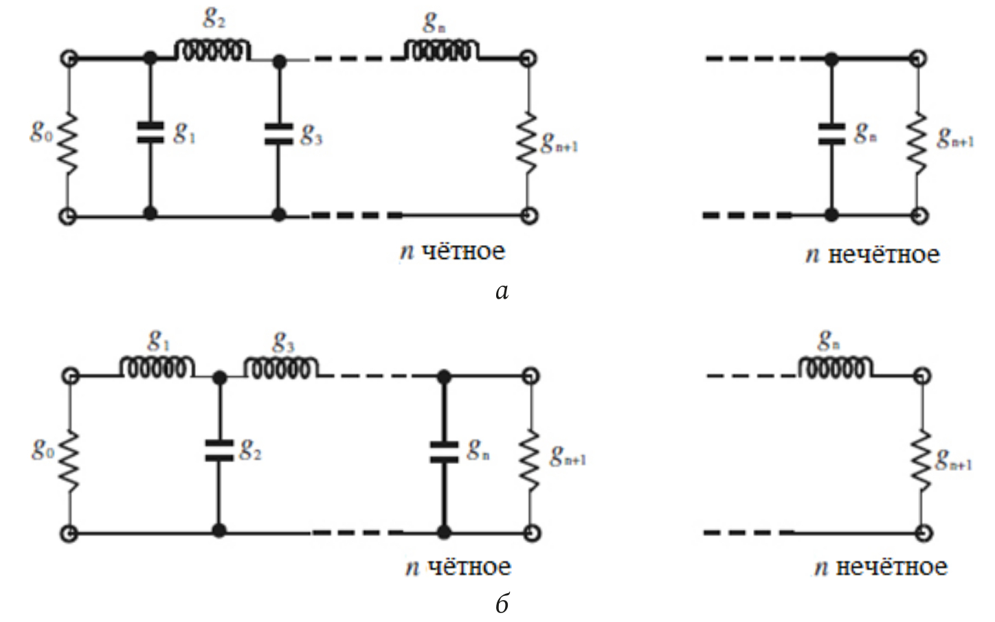 Прототип фильтра нижних частот в общем случае определяется как фильтр нижних частот, значения элементов которого нормализованы таким образом, что сопротивление или проводимость источника равны единице, обозначаемой , а угловая частота среза равна единице, обозначаемой (рад/с). Например, на рис. 6 показаны две возможные формы прототипа n-полюсного фильтра нижних частот для реализации полюсной характеристики фильтра, включая характеристики Баттерворта, Чебышева и Гаусса. Можно использовать любую из форм, поскольку они дают один и тот же отклик. Следует отметить, что на рис. 6 gi для значений i от 1 до n представляет собой либо индуктивность последовательной катушки индуктивности, либо емкость шунтирующего конденсатора. Следовательно, n является числом реактивных элементов.