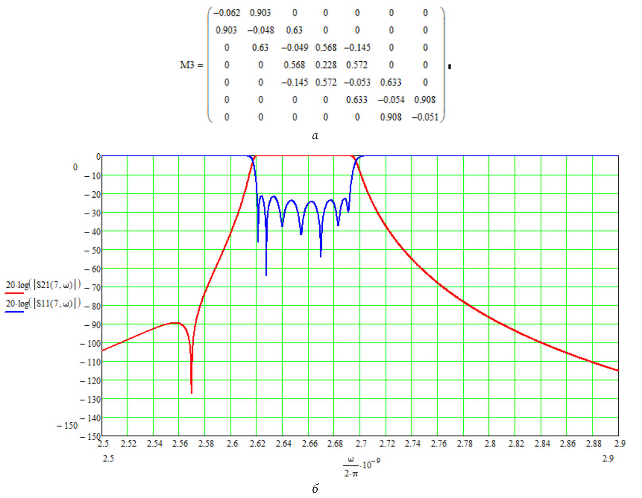 Рис. 11. Матрица связи (а) и характеристики передачи и отражения (б) фильтра Rх 7-го порядка с одной перекрестной связью