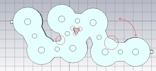 При моделировании фильтра задавались размеры резонаторов, винтов резонаторов и межрезонаторных переходов. При размещении резонаторов основной целью было добиться компактности конструкции и при этом учесть, что будут оптимизироваться размеры межрезонаторных переходов (рис. 13).