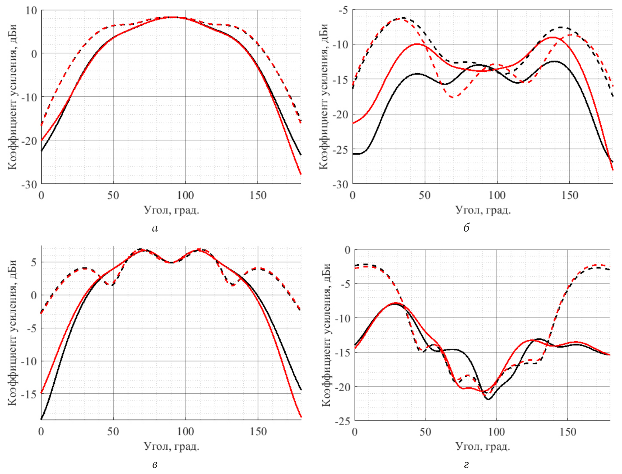 Рис. 2. Диаграммы направленности кросс-дипольного (а – со-поляризационная, б – кросс-поляризационная компоненты) и stacked – патч-элементов (в – со-поляризационная, г – кросс-поляризационная компоненты) для первого (черная линия) и второго (красная линия) порта. Пунктирной линией обозначены срезы вдоль направления поляризации порта, сплошной – перпендикулярно)