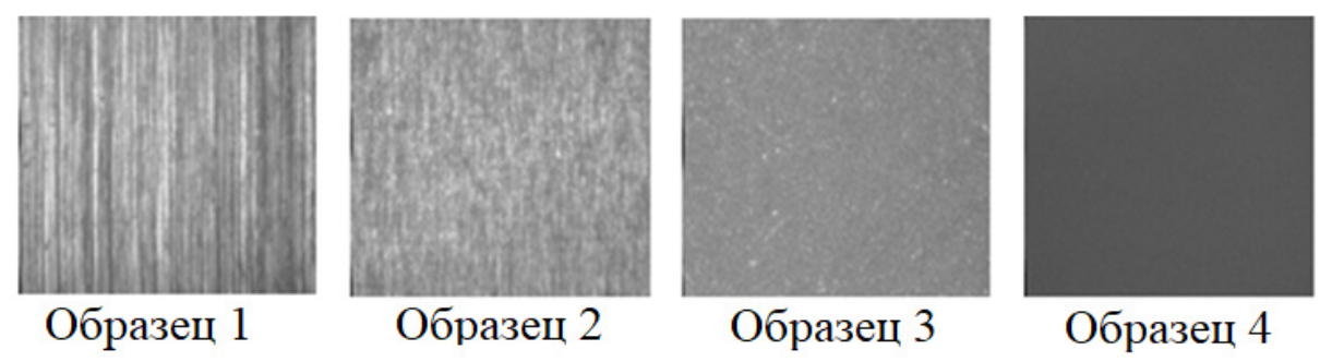 Определенные с помощью профилометра SJ-201P параметры шероховатости Ra микрорельефов поверхностей образцов 1–4 составили 0,13; 0,084; 0,048; 0,025 мкм соответственно [5]. Как видно из приведенного рис. 1, изображения текстур микрорельефов существенно отличаются друг от друга, при этом ориентация текстуры в вертикальном направлении полностью исчезает для более гладких поверхностей, полученных полированием. Отмеченная особенность в изменении характера изображений может свидетельствовать об усилении влияния случайной компоненты по отношению регулярной компоненте при изготовлении микрорельефов с более меньшими высотными параметрами.