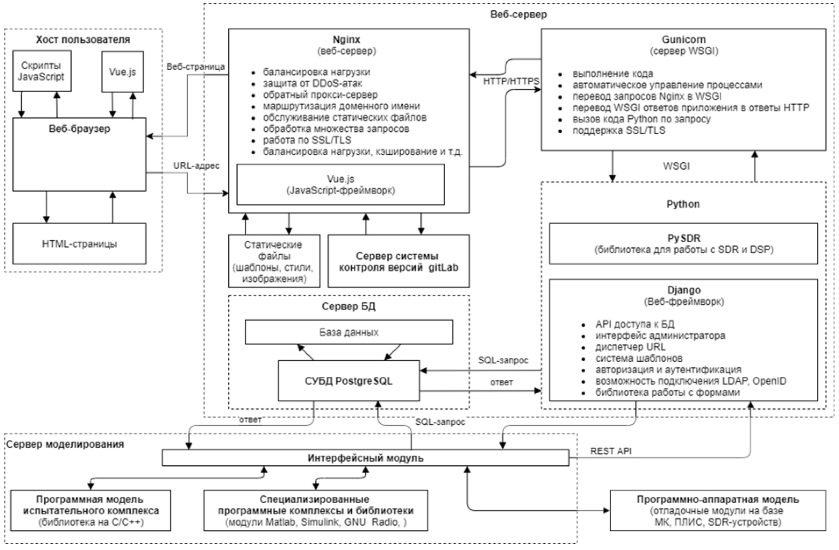 Рассмотренная выше модель оценки эффективности МЧС-МДАМ систем радиосвязи была реализована в виде распределенной программно-аппаратной платформы на базе стека технологий: Nginx 1.1 - 4.2, Gunicorn, СУБД PostgreSQL 11.0, Python 3.9, Django 4.0.5, Vue JS, Celery, PySDR, REST API [13]. Архитектура системы представлена на рис. 1.
