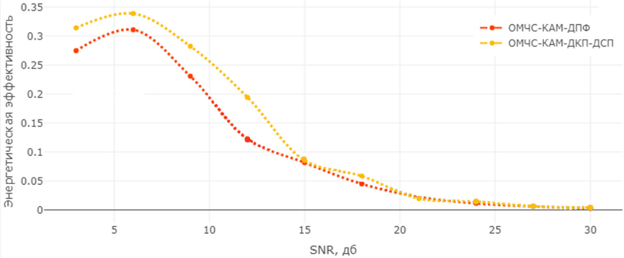 Рис. 5. График зависимости энергетической эффективности систем радиосвязи от ОСШ (КАМ-16, N = 32)