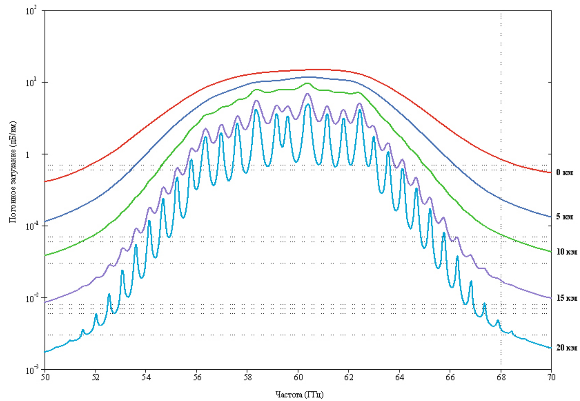 Рис. 4. Затухание в диапазоне 50–70 ГГц на указанных высотах, рассчитанное с шагом 50 МГц, включая центры линий поглощения (0, 5, 10, 15 и 20 км)