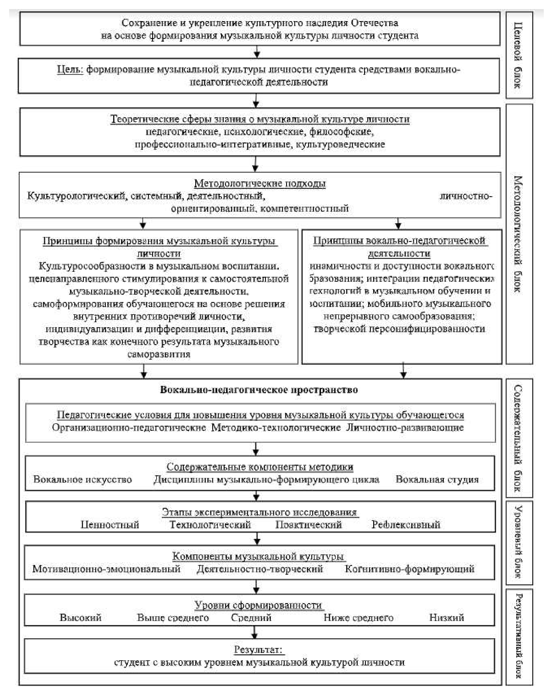 Методологический блок разработанной модели включал комплекс взаимосвязанных методологических подходов и двух комплексов принципов построения авторского исследования: по основам формирования музыкальной культуры личности и эффективной реализации вокально-педагогической деятельности. Содержательный, уровневый и результативный блоки были системно объединены в единое вокально-педагогическое пространство, в котором основными структурными компонентами являлись вокально-педагогические условия, содержательные компоненты методики и этапы экспериментального исследования. В итоге разработки авторской модели уровневый и результативный блок через выявление ключевых компонентов музыкальной культуры личности студента (мотивационно-эмоциональный, деятельностно-творческий и когнитивно-формирующий) и уровней сформированности музыкальной культуры личности обучающегося определили главный и самый важный результат исследовательского процесса: студент со сформированной музыкальной культурой личности.