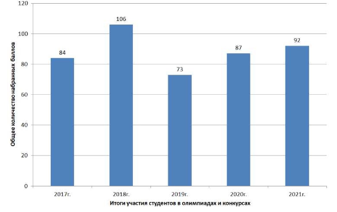 Баллы, полученные студентами на профильных строительных олимпиадах и конкурсах высоких технологий, суммировались по заранее установленной системе начисления баллов, согласованной с членами жюри строительных вузов. На рисунке 1 показаны результаты участия студентов КГАСУ (Казанского государственного архитектурно-строительного университета) в соревнованиях российского этапа.
