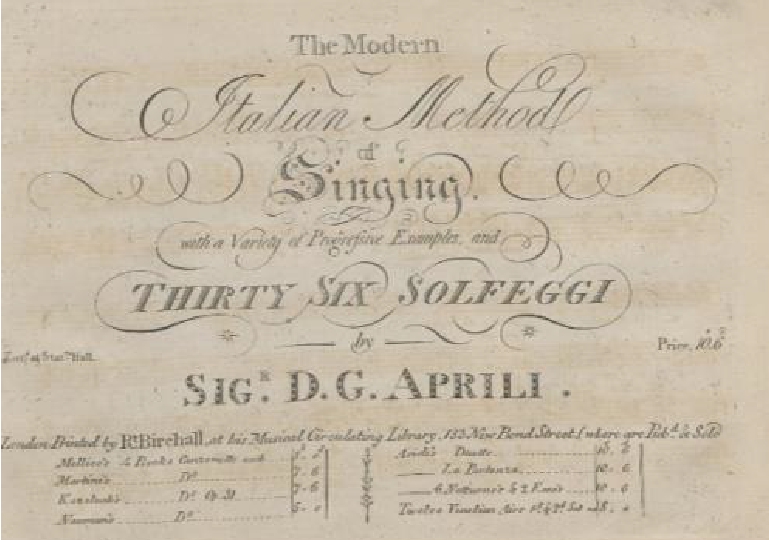 Сборник Дж. Априле «Итальянская школа пения: с приложением 36 примеров сольфеджио» был опубликован в 1791 году [1]. Судя по титульному листу (см. Рис. 1), автор предлагает универсальный метод обучения певцов (кастратов или же нет) и певиц с помощью «различных постепенно усложняющихся примеров» (“variety of progressive Examples”) и «36 упражнений сольфеджио» (“36 Solfeggi”). Структура сборника представляет собой методическое пояснение, набор примеров для развития вокальной техники (отдельные звуки, пассажи гамм, интервальные скачки и т. д.) и уже потом – 36 сольфеджио в сопровождении цифрованного баса.
